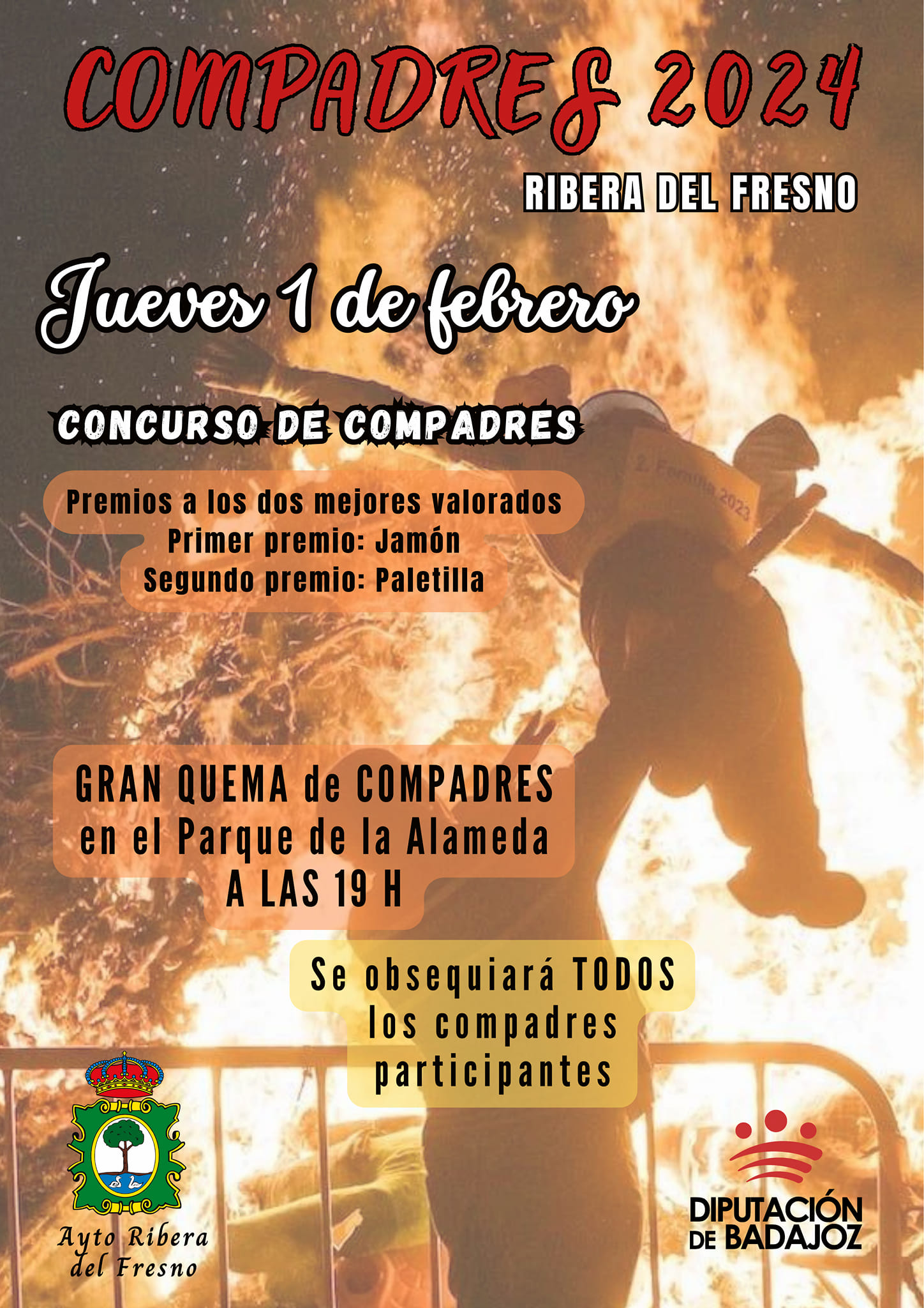 El compadre ganador del primer premio, que recibirá un suculento jamón, será indultado y se librará de la tradicional quema de Compadres. Este año, el afortunado compadre pasará a formar posesión del Ayuntamiento de Ribera del Fresno.