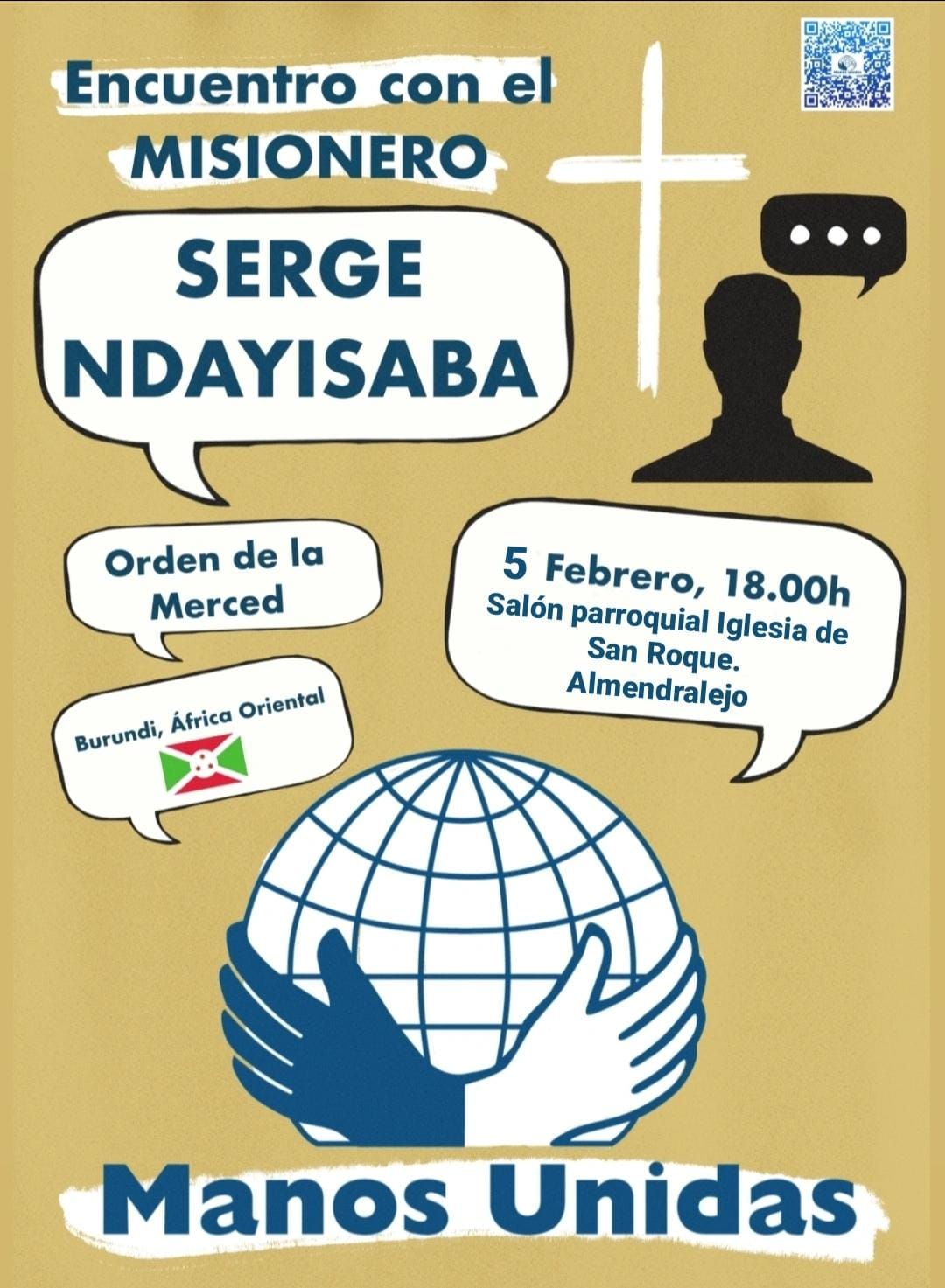 Se aproxima la fecha de la campaña de Manos Unidas (10 y 11 de febrero) , campaña que ya ha sido lanzada a nivel nacional y desde la Delegación de Badajoz se van a llevar a cabo diversas actividades en Almendralejo, donde va estar el misionero mercedario padre Serge Ndayisaba el lunes 5 de febrero, natural de Burundi, ha trabajado con Manos Unidas en Camerún.