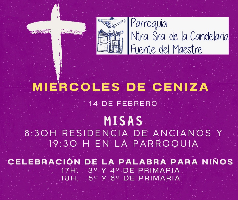 A lo largo del Miércoles de Ceniza se llevarán a cabo diferentes celebraciones de la Palabra, a las 17:00 horas para los niños de 3º y 4º de primaria, y a las 18:00 horas para los niños de 5º y 6º de primaria. Y a las 19:30 horas, tendrá lugar la Misa en la Parroquia.