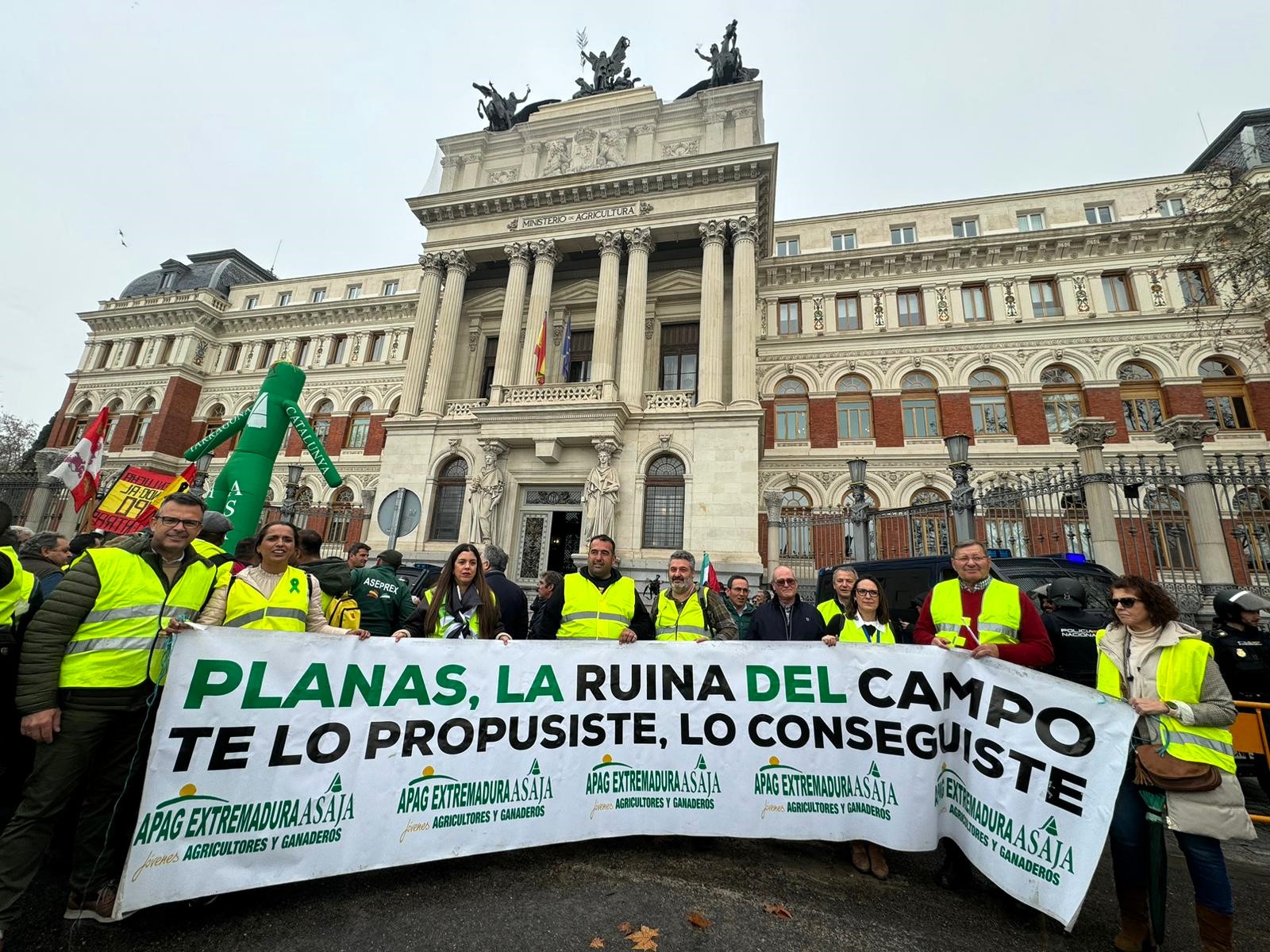 Representantes de la Comunidad de Labradores y Ganaderos de Almendralejo acudieron en apoyo de APAG-Asaja-Extremadura, y mostraron su malestar con una pancarta en la que se podía leer el eslogan “Planas, la ruina del campo. Te lo propusiste, lo conseguiste”.