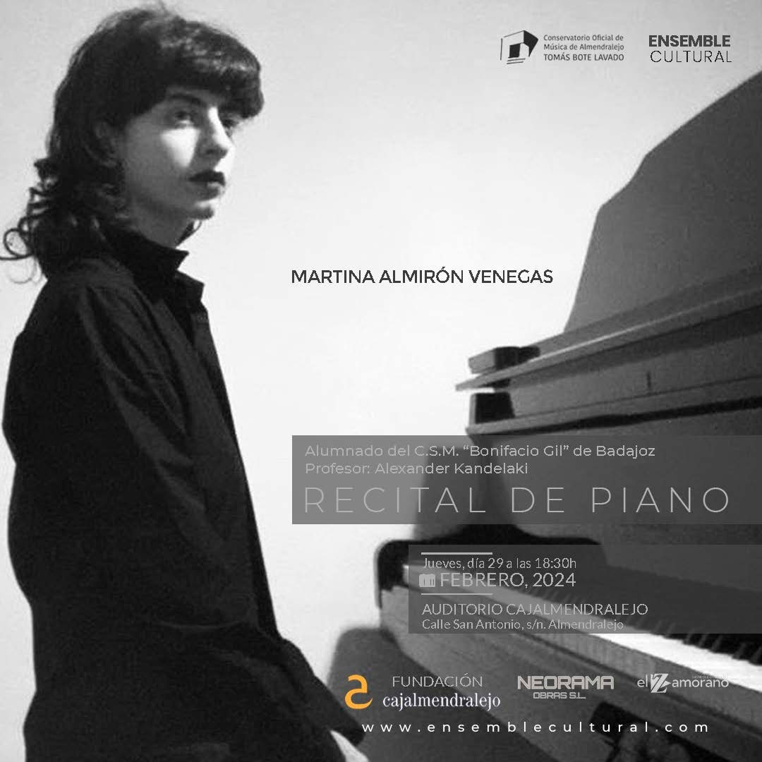 Almendralejo acogerá este jueves un recital de piano del alumnado del Conservatorio Superior de Badajoz, organizado por el Conservatorio Tomás Bote Lavado, en colaboración con la asociación Ensemble Cultural, como inauguración del “I curso de formación pianística“.