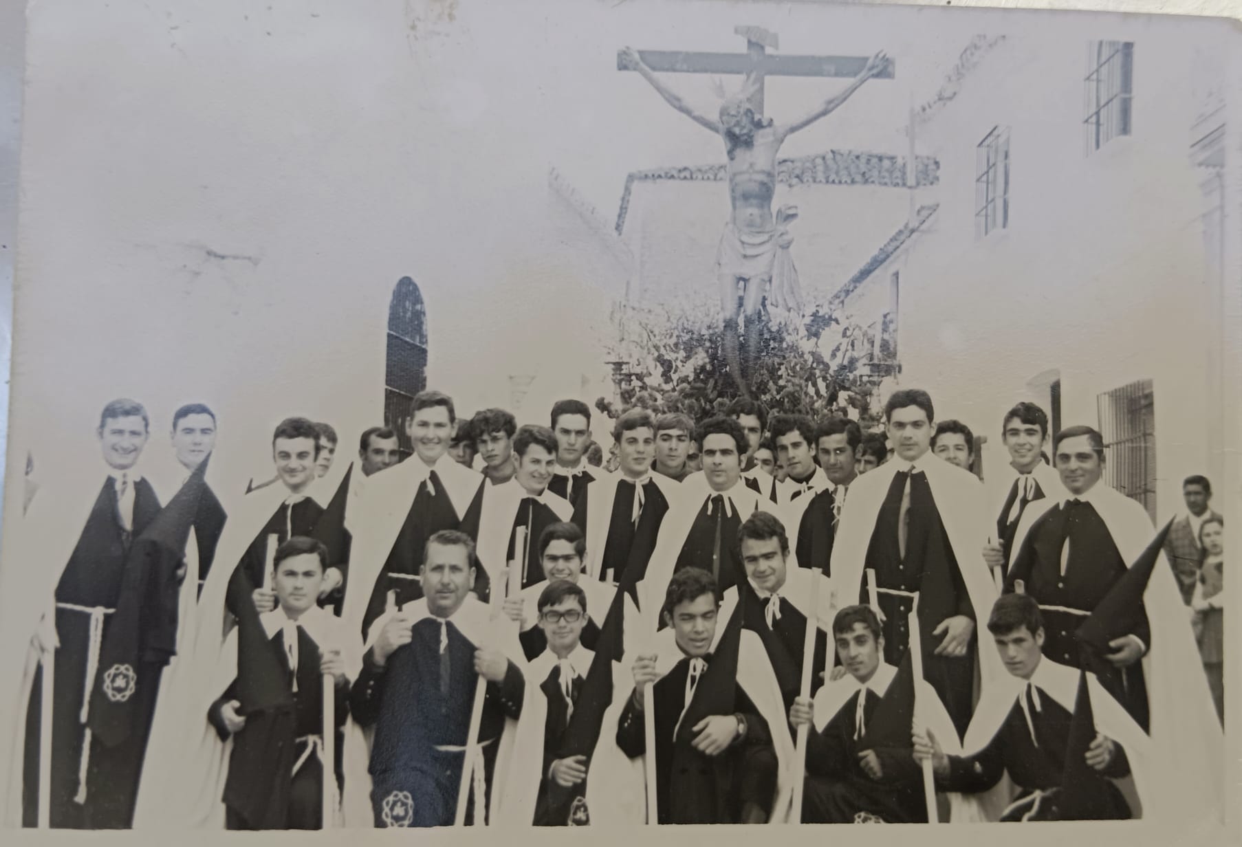 Lo que sí es cierto que en ese año 69, según recoge José María Ruíz Bazo, corresponsal del Diario HOY en Ribera del Fresno en ese año, “el Santísimo Cristo del Rosario fue acompañado por señoritas, que en la noche del Jueves Santo hizo su salida procesional por vez primera, instalado con magnífico gusto en un precioso paso. Así como procesiones que desfilaron nazarenos y señoritas ataviadas con la clásica mantilla”.