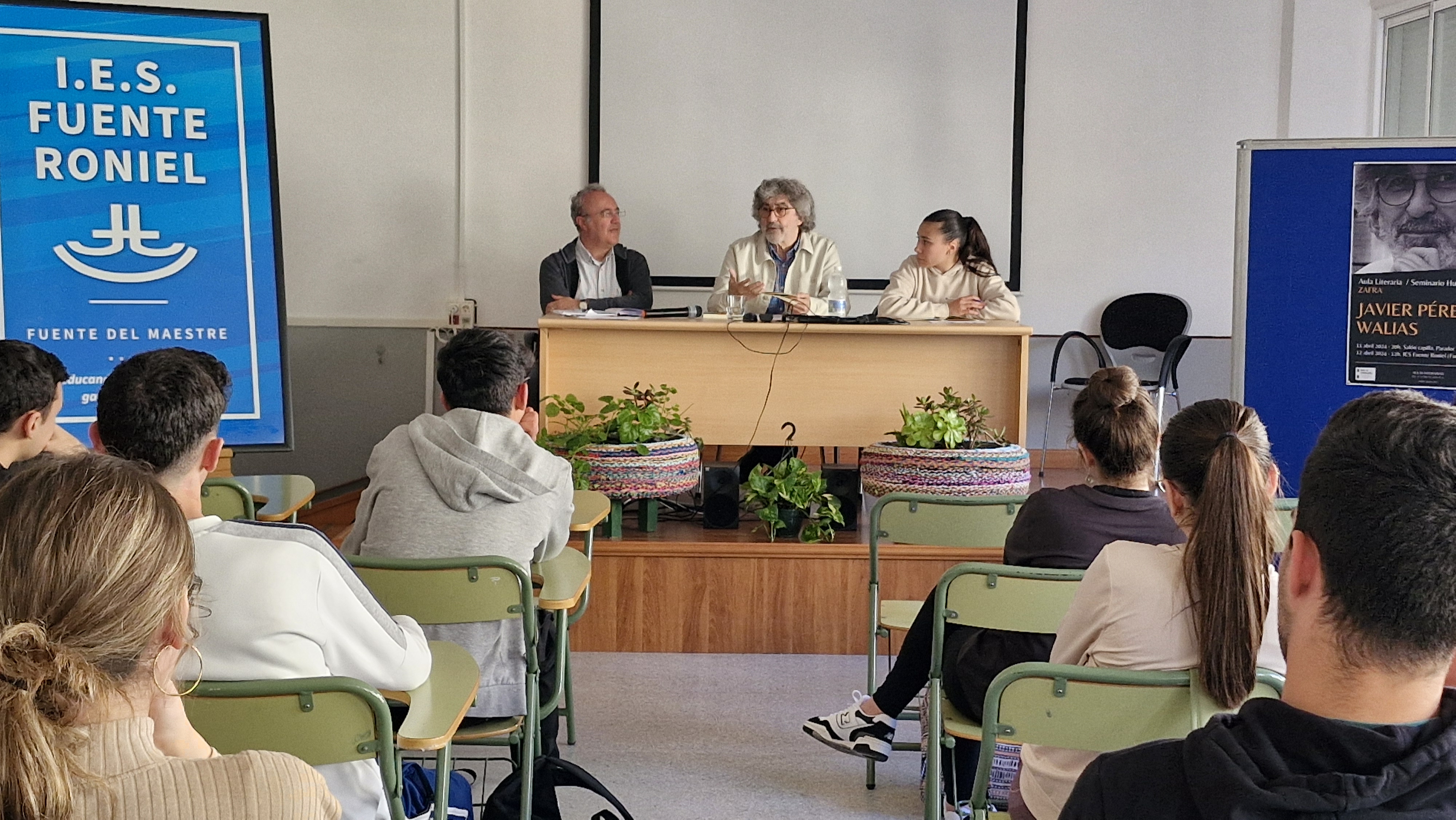 El poeta placentino Javier Pérez Walias ha llegado al IES Fuente Roniel de Fuente del Maestre “muy feliz y emocionado de volver al aula, a lo que ha sido mi territorio durante buena parte de mi vida”.