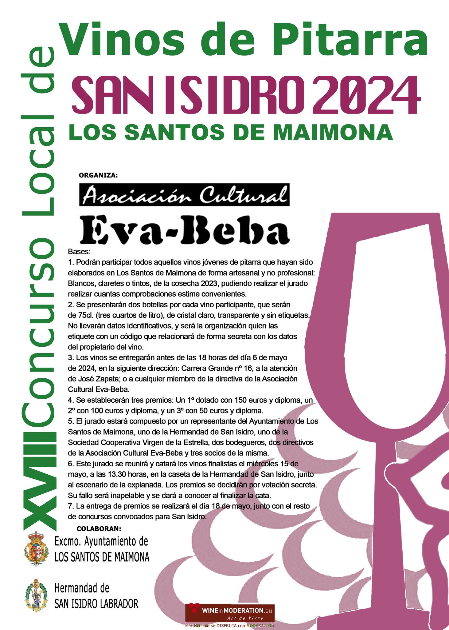 El jurado estará compuesto por un representante del Ayuntamiento de Los Santos de Maimona, uno de la Hermandad de San Isidro, uno de la Cooperativa Virgen de la Estrella, dos bodegueros, dos directivos de la Asociación Cultural Eva-Beba y tres socios de la misma.