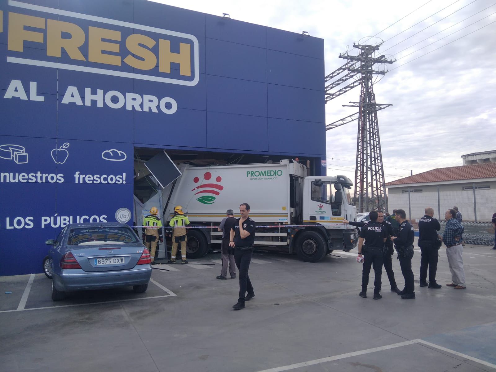 Un camión de basura de la empresa Promedio se ha empotrado contra la puerta de un supermercado en la localidad pacense de Villafranca de los Barros, donde ha causado importantes daños materiales.