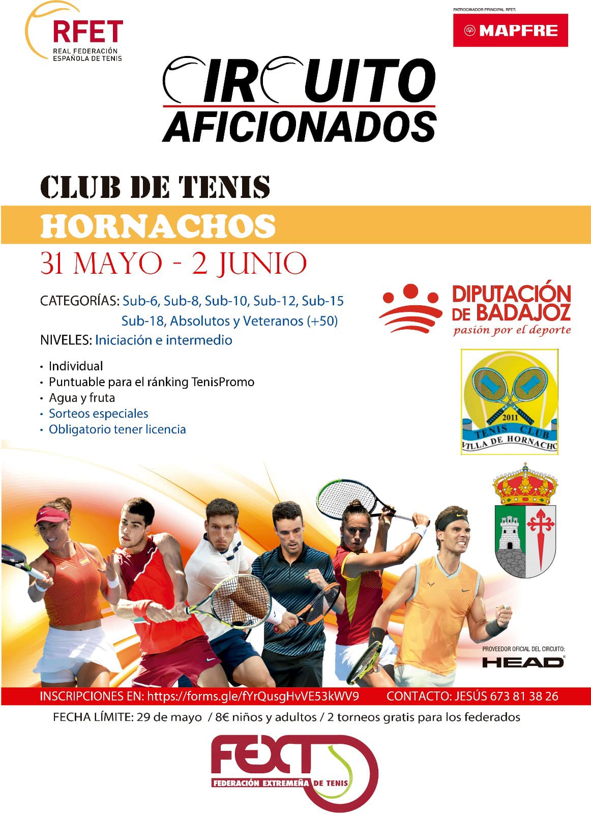 El Villa de Hornachos Tenis Club y la Real Federación Española de Tenis, con el patrocinio del Ayuntamiento de Hornachos y la Diputación de Badajoz, te ofrecen los próximos días 31 de mayo y 1 y 2 de junio el Circuito Aficionados, Trofeo Diputación de Badajoz, en Hornachos.