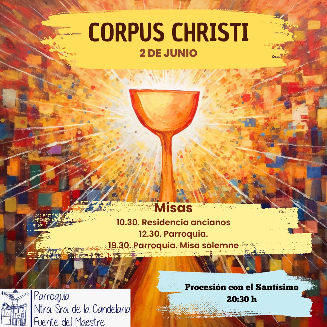 Ya el domingo día 2, día del Corpus Christi, habrá misa a las 10:30 horas en la Residencia de Ancianos y, a continuación, procesión por dentro de la Residencia. Además, en la Parroquia, se celebrará la Eucaristía a las 12:30 horas, y a las 19:30 horas se iniciará la Misa Solemne del Corpus que continuará con la procesión con el Santísimo. La colecta de las misas del fin de semana irá destinada a Cáritas.
