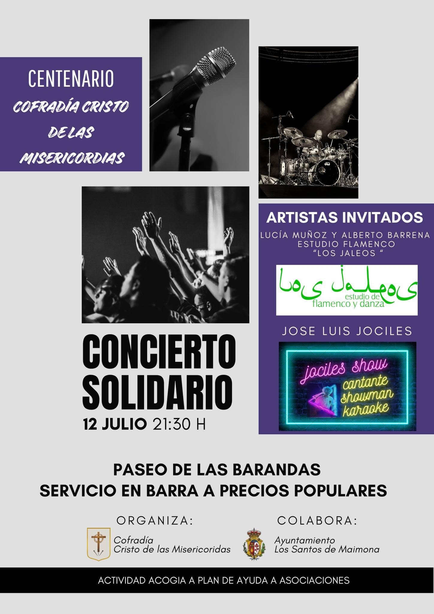 La Cofradía del Cristo de las Misericordias ha organizado para el próximo viernes, 12 de julio, un concierto solidario en la Plaza de España. Es otra de las actividades organizadas por la conmemoración de su centenario y cuenta con la colaboración del Ayuntamiento de Los Santos de Maimona a través de su Plan de Ayudas a Asociaciones Locales.