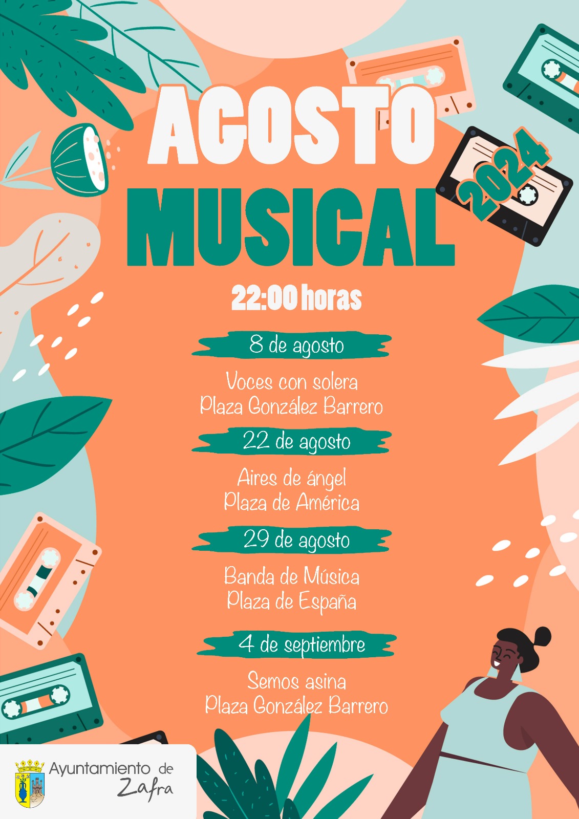 Los conciertos darán comienzo este 8 de agosto con la actuación del grupo Voces con Solera, en la Plaza González Barrero; seguido del Coro Rociero ‘Aires de Ángel’ el 22 de agosto en la Plaza América; el 29 de agosto la Banda de Música ofrecerá un concierto en la Plaza de España y terminarán el día 4 de septiembre con la actuación del grupo teatral Semos Asina en la Plaza González Barrero. Todas las actuaciones están previstas que comiencen a las 22:00 horas.