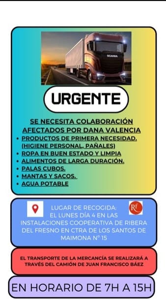 La iniciativa cuenta con el apoyo de la Cooperativa de Ribera del Fresno, que cede sus instalaciones para facilitar la carga y logística. “Invitamos a divulgar este mensaje en otros grupos y a sumar a cualquier persona que desee colaborar”, añadió Báez, con la esperanza de llenar el camión entre lunes y martes y hacer llegar la ayuda lo antes posible a quienes más la necesitan. Por Juan Francisco Llano Báez