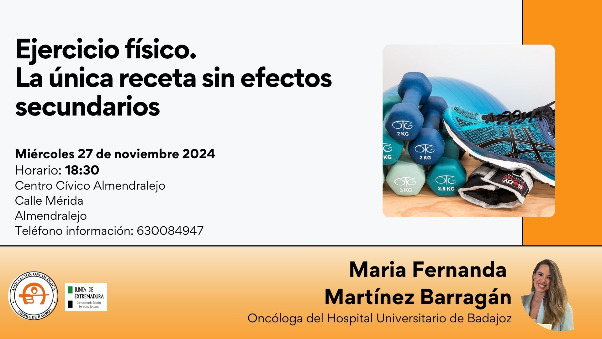 La Asociación Oncológica Tierra de Barros organiza la ponencia «Ejercicio físico. La única receta sin efectos secundarios» , de la mano de la Dra. María Fernanda Martínez Barragán, oncóloga del Hospital Universitario de Badajoz.