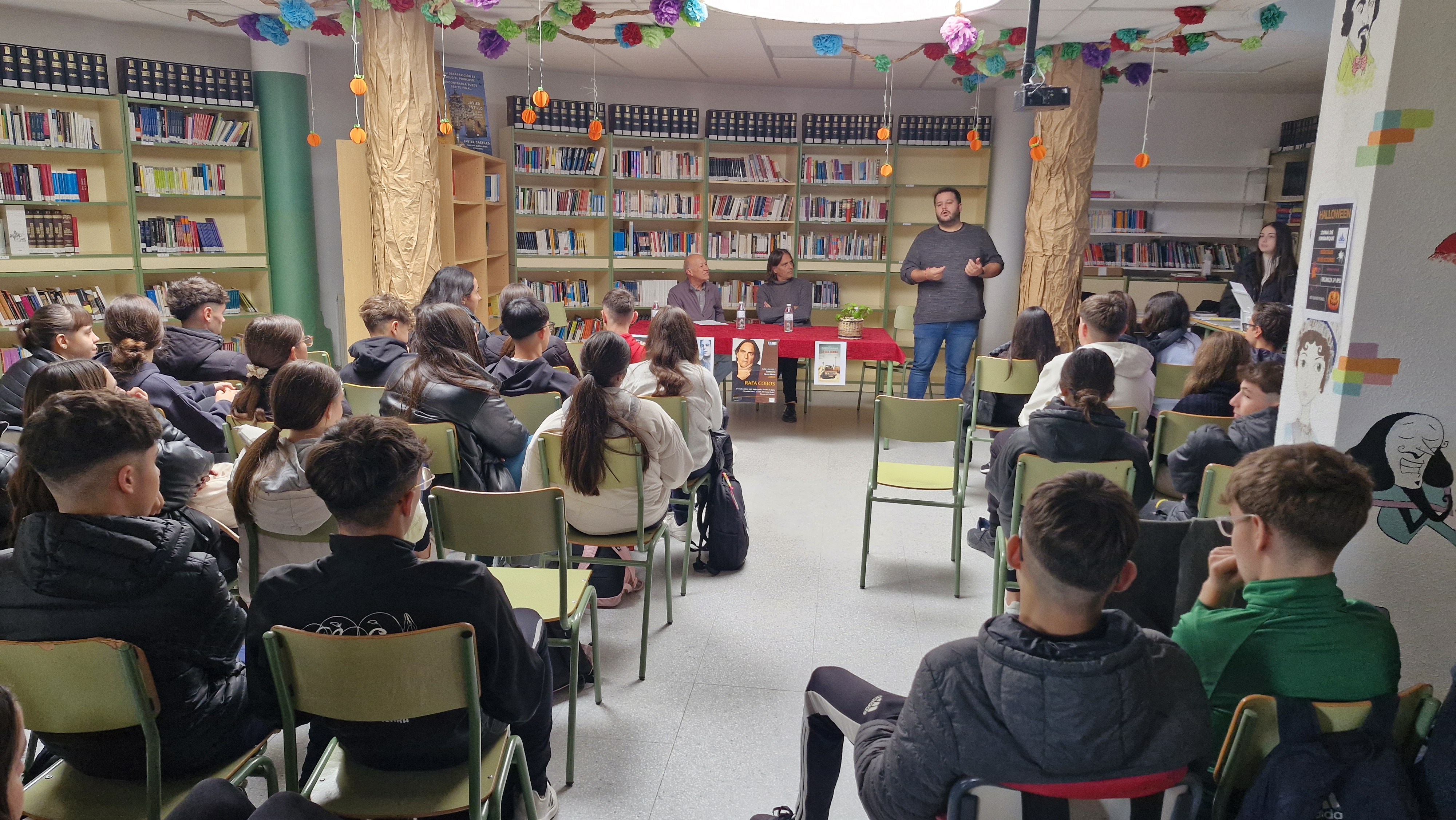 Alumnos de 4º de la Eso del Ies. Fuente Roniel de Fuente del Maestre (Badajoz) han mantenido en la biblioteca del centro, este martes 26 de noviembre, un encuentro con el escritor y guionista Rafa Cobos.