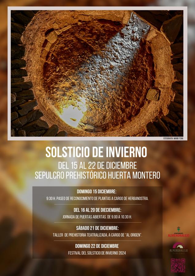 El sábado 21 de diciembre, a partir de las 9.15 horas, será el momento de observar el sol y disfrutar de la paz que otorga ese instante. Más tarde, se realizará una actividad a cargo de “Al Origen” dirigida a pequeños y mayores para vivir la prehistoria en Huerta Montero. Esta actividad que cuenta con un aforo máximo de 72 personas será gratuita y necesita de inscripción previa. Durante la mañana se realizarán talleres sobre la ritualidad y ofrendas, cerámica neolítica y calcolítica, recursos de los animales y tiro con arco.