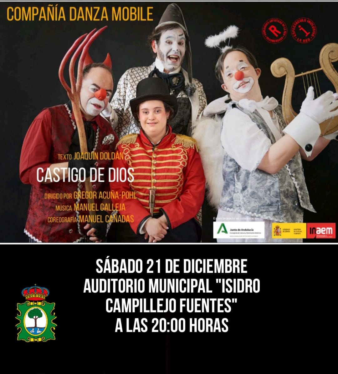 El próximo sábado, el Auditorio Municipal “Isidro Campillejo Fuentes” acogerá la representación de la obra de teatro inclusivo “Castigo de Dios”, un espectáculo único a cargo de la prestigiosa compañía Danza Mobile. La función, que comenzará a las 20:00 horas, promete sorprender y emocionar al público con una fusión de danza, lenguaje visual, teatro y números musicales en clave clown.