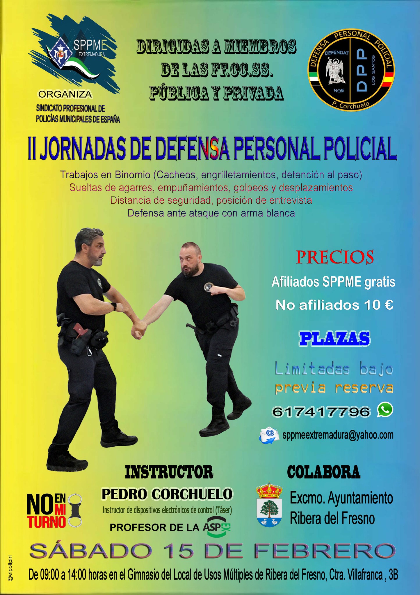El Sindicato Profesional de Policías Municipales (SPPME), a través de la sección de Villafranca de los Barros, ha organizado un curso intensivo de defensa personal policial en Ribera del Fresno dentro de las II Jornadas de Defensa Personal Policial.