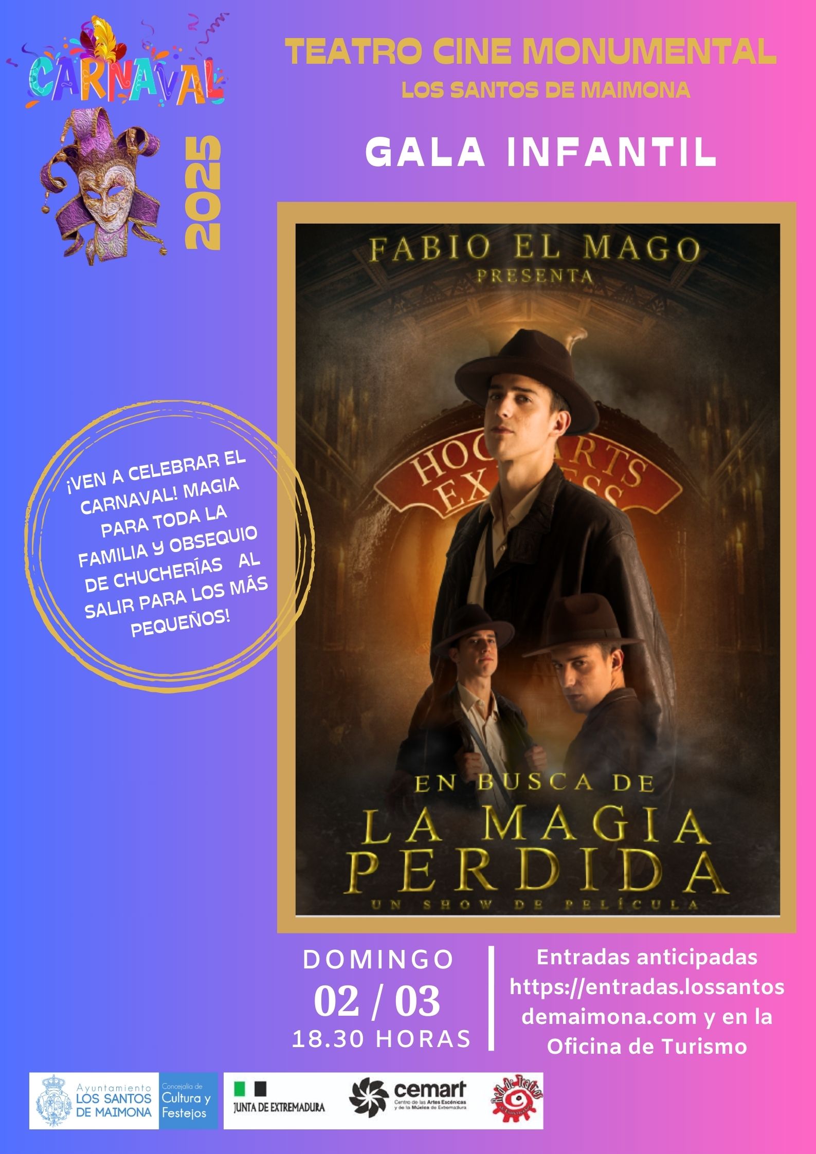 El público familiar podrá disfrutar este domingo de Carnaval, día 2 de marzo, de un espectáculo especialmente pensado para ellos: ‘En busca de la magia perdida’, a cargo de Fabio el Mago. Comenzará a las 18.30 horas en el Teatro Cine Monumental.