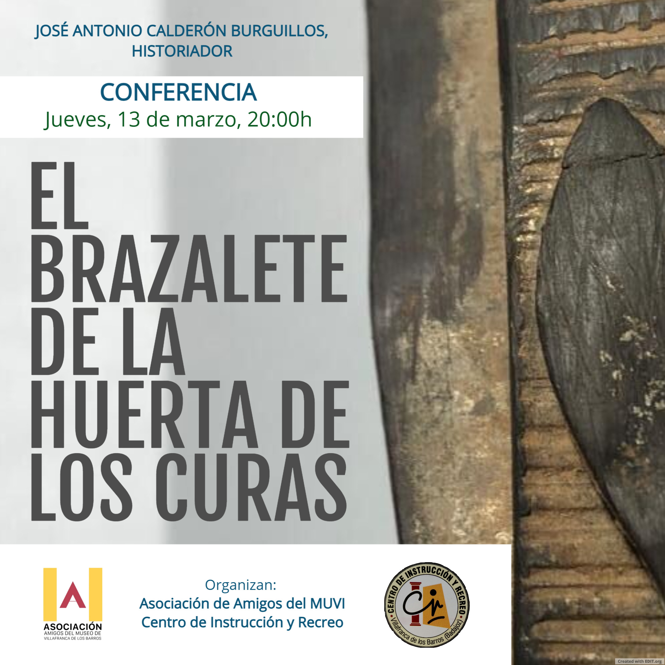 El próximo jueves, 13 de marzo, a las 20:00 horas en las instalaciones del Centro de Instrucción y Recreo tendrá lugar una conferencia de José Antonio Calderón Burguillos sobre un reciente hallazgo arqueológico en el término de Villafranca de los Barros: el Brazalete de la Huerta de los Curas.
