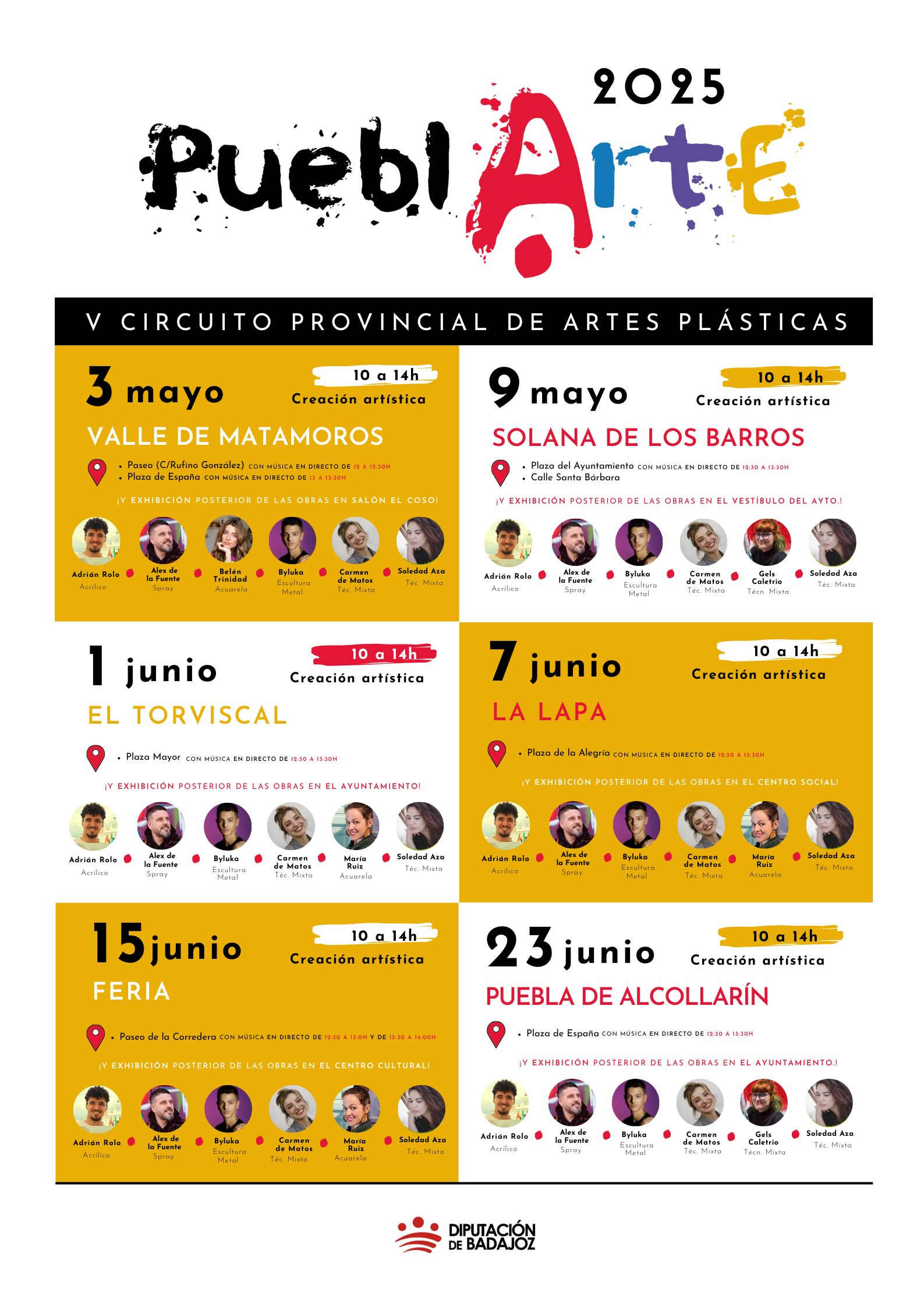 Nombres como Carmen de Matos, Byluka, María Ruiz, Alex de la Fuente, Adrián Rolo, Ges Caletrio, Belén Trinidad y Soledad Aza se repartirán por Valle de Matamoros, Solana de los Barros, El Torviscal, La Lapa, Feria y Puebla de Alcollarín. Y lo harán a través de la técnica mixta, de la escultura en metal, de la acuarela, del spray o del acrílico.