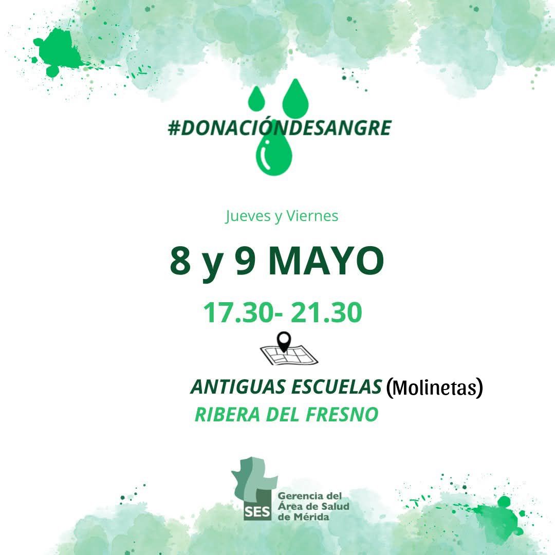 El próximo jueves 8 y viernes 9 de mayo, el municipio de Ribera del Fresno se suma a la campaña de donación de sangre impulsada por la Hermandad de Donantes de Sangre de Badajoz y la Gerencia del Área de Salud de Mérida (SES), con una nueva colecta que se realizará en las antiguas escuelas de las Molinetas en horario de 17:30 a 21:30 horas.