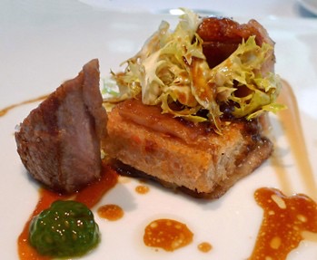 tomate y el bocadillo de cabrito con pan con tomate, una hoja de achicoria y la escarola aliñada con el jugo de cabrito caliente, cortado con aceite de oliva pero sin emulsionar.