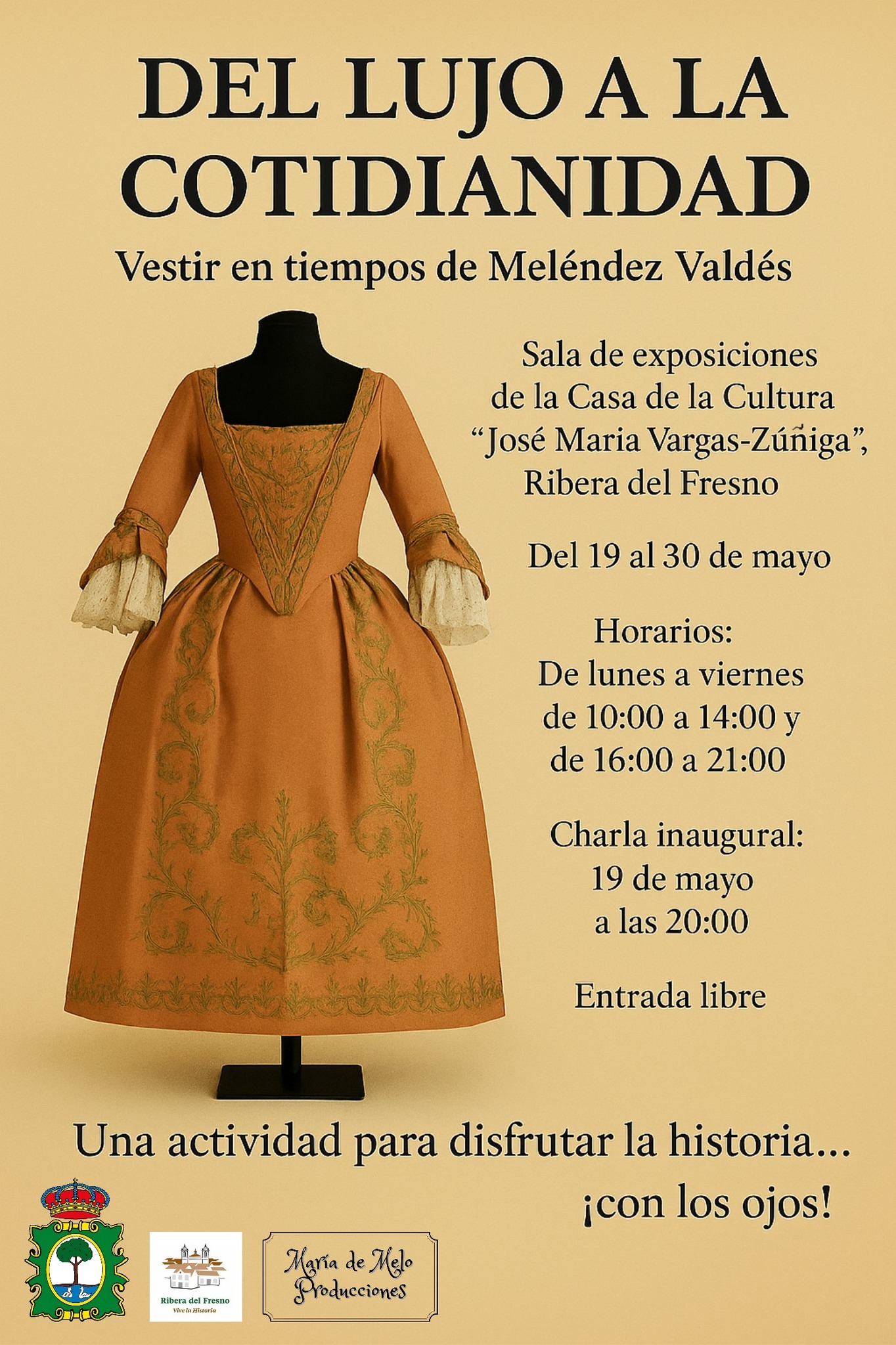 Organizada por la Concejalía de Cultura en colaboración con María de Melo Producciones, esta muestra propone un recorrido visual por el vestuario de finales del siglo XVIII y principios del XIX, época que coincide con la vida y obra de Juan Meléndez Valdés, figura clave de la Ilustración española nacida en Ribera del Fresno. La exposición podrá visitarse gratuitamente del 19 al 30 de mayo, en horario de lunes a viernes de 10 a 14 h y de 16 a 21 h.