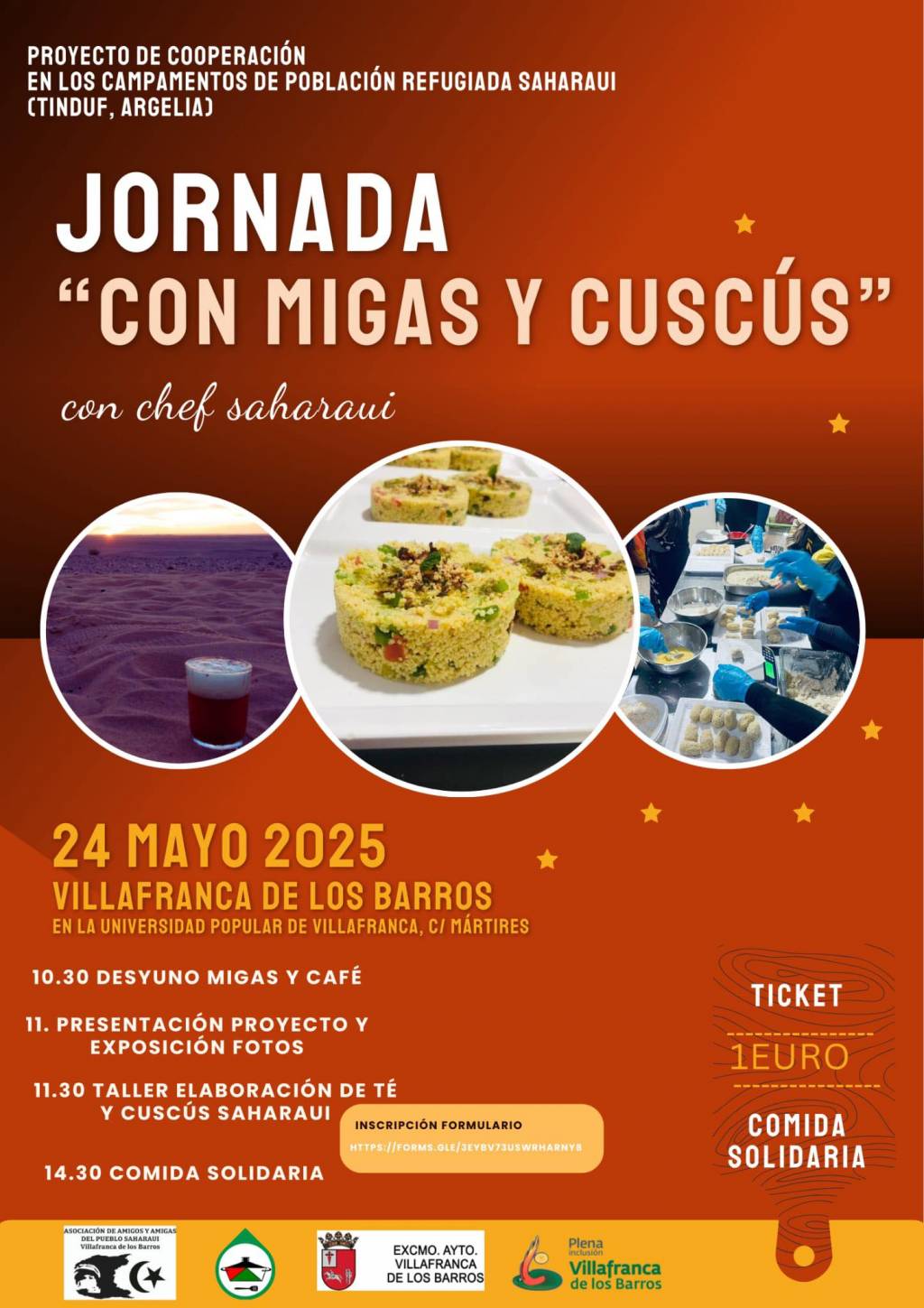 Según han informado, a las 10:30 comenzaremos con un desayuno típico extremeño, migas y café. A las 11:00 será la presentación del proyecto y a las 11:30 Taller elaboración de té y cuscús saharaui a cargo de un chef saharaui.