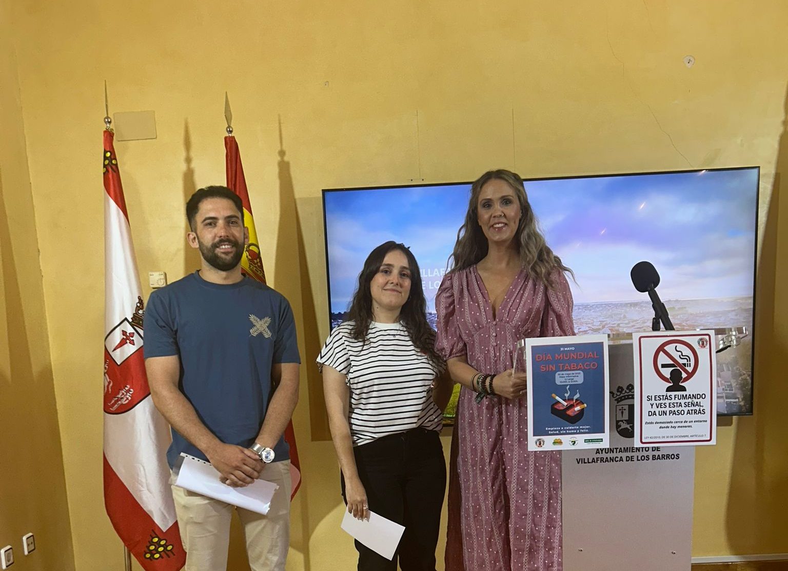 La concejala de Servicios Sociales, Infancia y Agenda 2030, Marian Vicente, ha presentado hoy la Campaña Municipal con motivo del Día Mundial Sin Tabaco, acompañada por el educador social de AMADROVI, Alberto Caballero; y por la técnica de Proprefame Villafranca, Marga Rangel.
