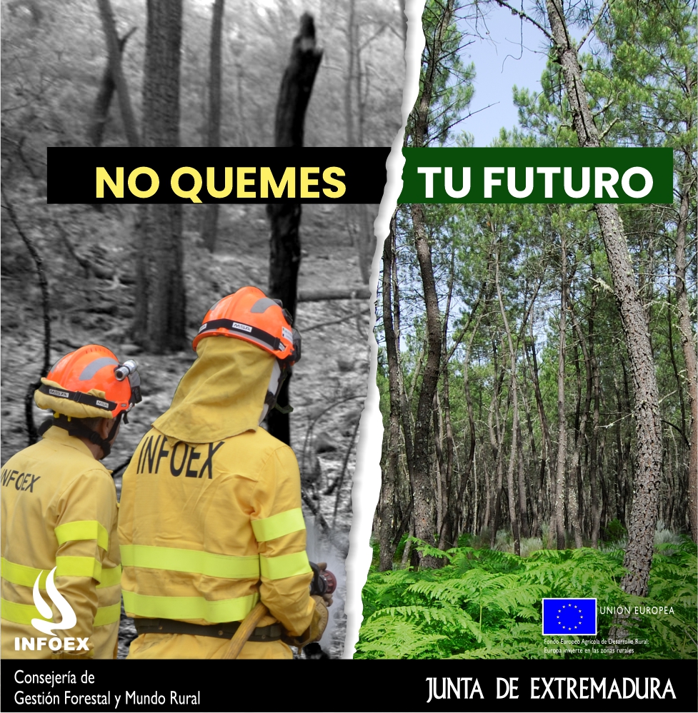 El Plan INFOEX ha puesto en marcha una campaña publicitaria para sensibilizar a los extremeños frente a los incendios forestales con el lema ‘Planta cara al fuego, no quemes tu futuro’, que comienza hoy lunes, 16 de junio, y tendrá una amplia difusión en televisión, emisoras de radio, prensa escrita, cartelería, internet y redes sociales. Tomando como referencia el soporte principal del cartel, la campaña muestra una contraposición entre un pinar verde y un paisaje quemado.