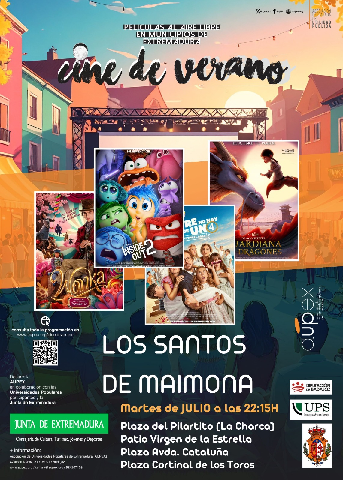 El Cine de Verano vuelve como cada año los martes del mes de julio a diferentes puntos de la localidad: el 1 de julio se proyectará la película ‘Wonka’ en la plaza del Pilarito; el día 8 de julio se podrá ver en el patio del Santuario de la Virgen de la Estrella ‘Inside Out 2’; en la plaza de la avenida de Cataluña se proyectará ‘Padre no hay más que uno 4’ el 15 de julio; y el 22 de julio el Cine de Verano se clausurará en la plaza del Cortinal de los Toros con ‘Guardiana de dragones’. Todas las películas comenzarán a las 22.15 horas y son gratuitas.