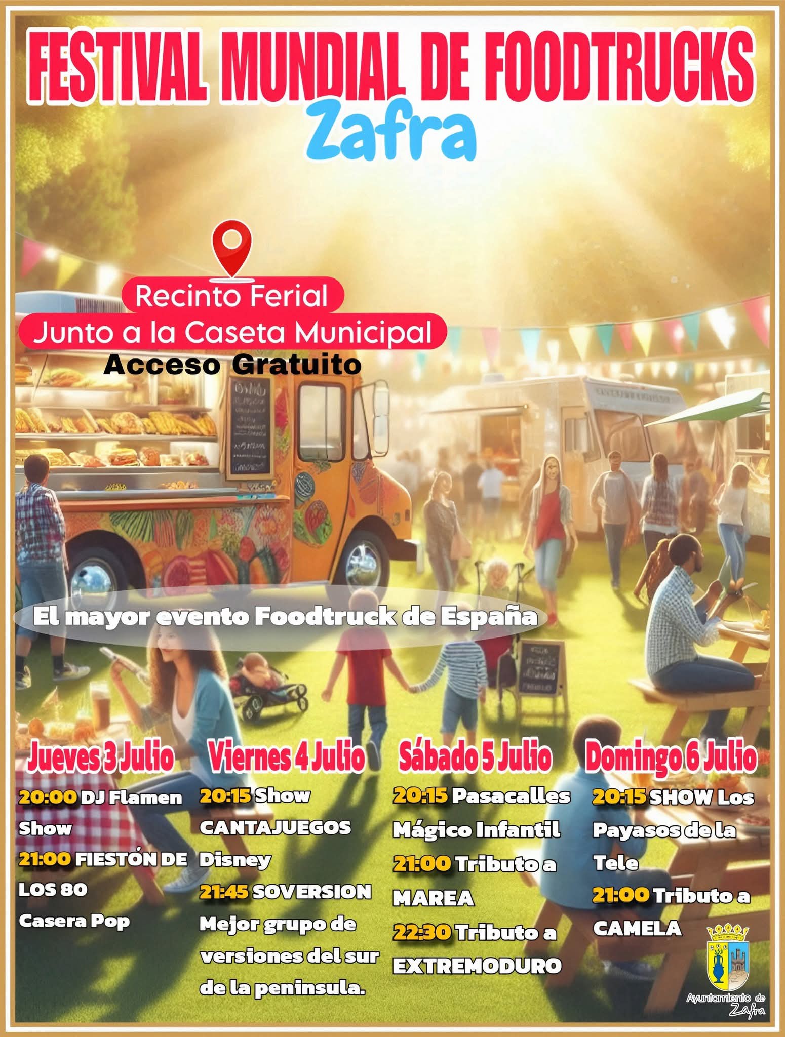 Del jueves 3 al domingo 6 de julio, el Recinto Ferial de Zafra, junto a la Caseta Municipal, se convertirá en el epicentro de la música, la gastronomía y el entretenimiento con la llegada del Festival Mundial de Foodtrucks, un evento con acceso gratuito organizado con la colaboración del Ayuntamiento de Zafra.
