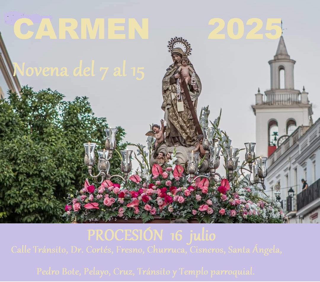 El repique de las campanas de la Parroquia del Carmen marcará cada tarde el inicio de la novena, una práctica que se mantiene viva año tras año y que dará comienzo con el rezo del Santo Rosario a las 20:30 h, seguido de la Eucaristía a las 21:00 h y el posterior ejercicio de la novena.