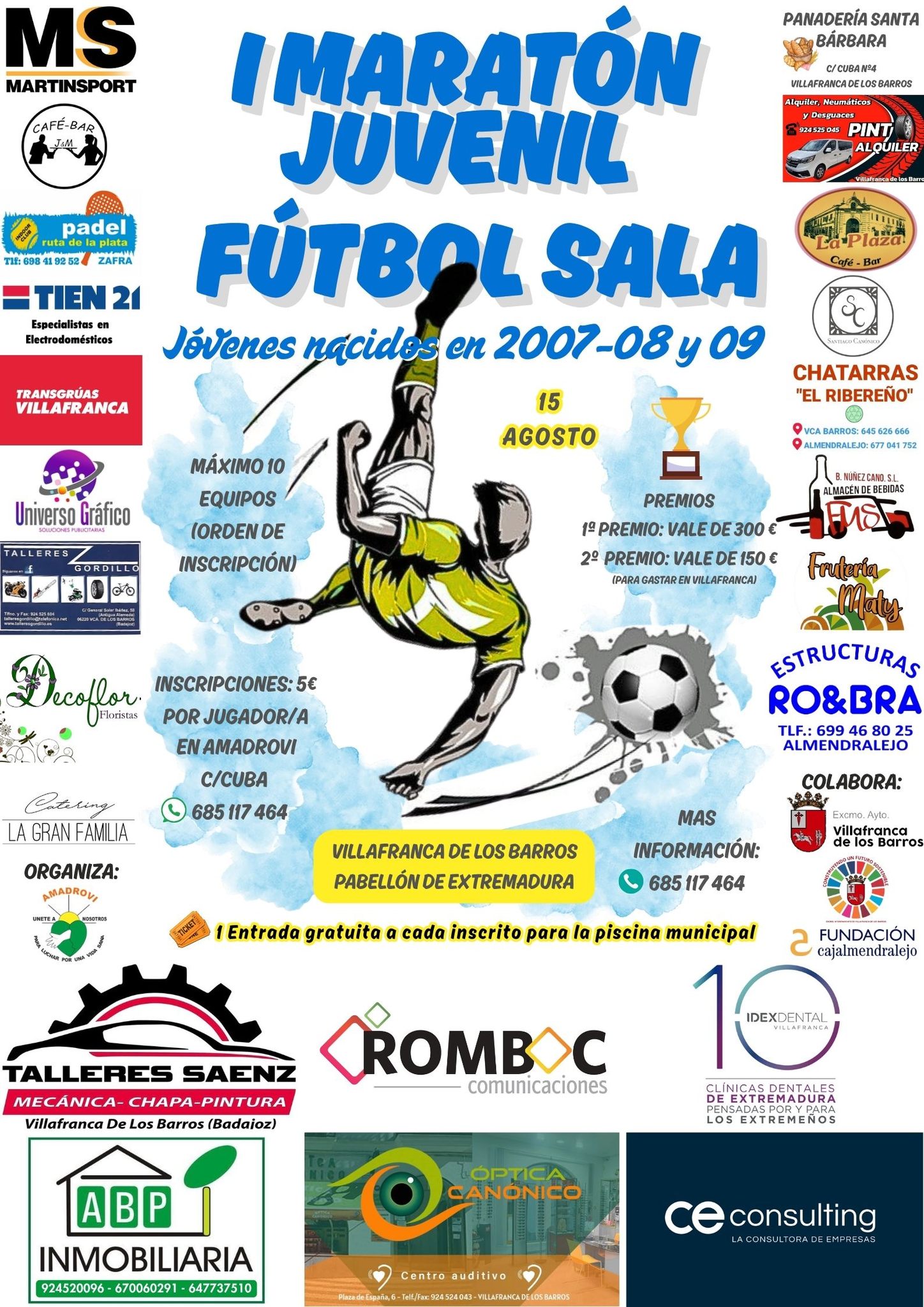 El próximo 15 de agosto se celebrará en el Pabellón Extremadura de Villafranca de los Barros el I Maratón Juvenil de Fútbol Sala, una iniciativa dirigida a jóvenes de entre 16 y 18 años nacidos en 2007, 2008 y 2009. La propuesta ha buscado ofrecer una alternativa de ocio lúdica, deportiva y solidaria durante el verano.