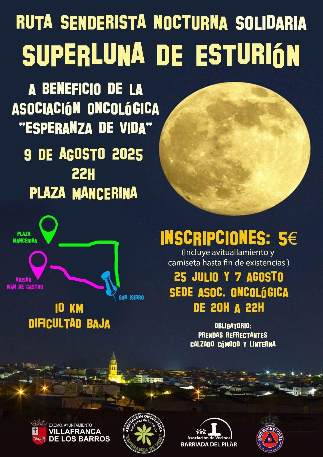 Villafranca de los Barros ha impulsado la Ruta Senderista Nocturna Solidaria «Superluna de Esturión», que tendrá lugar el próximo 9 de agosto a las 22:00 horas desde la Plaza Mancerina, con el objetivo de recaudar fondos a beneficio de la Asociación Oncológica «Esperanza de Vida».