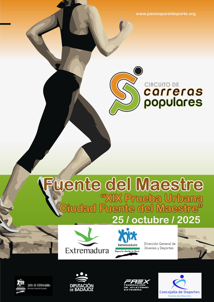 El Patronato Municipal de Deportes de Fuente del Maestre ha informado que ya se encuentra abierto el plazo de inscripción para participar en la XIX Prueba Urbana “Ciudad de Fuente del Maestre”, puntuable para el Circuito de Pruebas Urbanas de la Diputación de Badajoz, que se llevará a cabo el próximo 25 de octubre a partir de las 17:00 horas. La inscripción será gratuita.