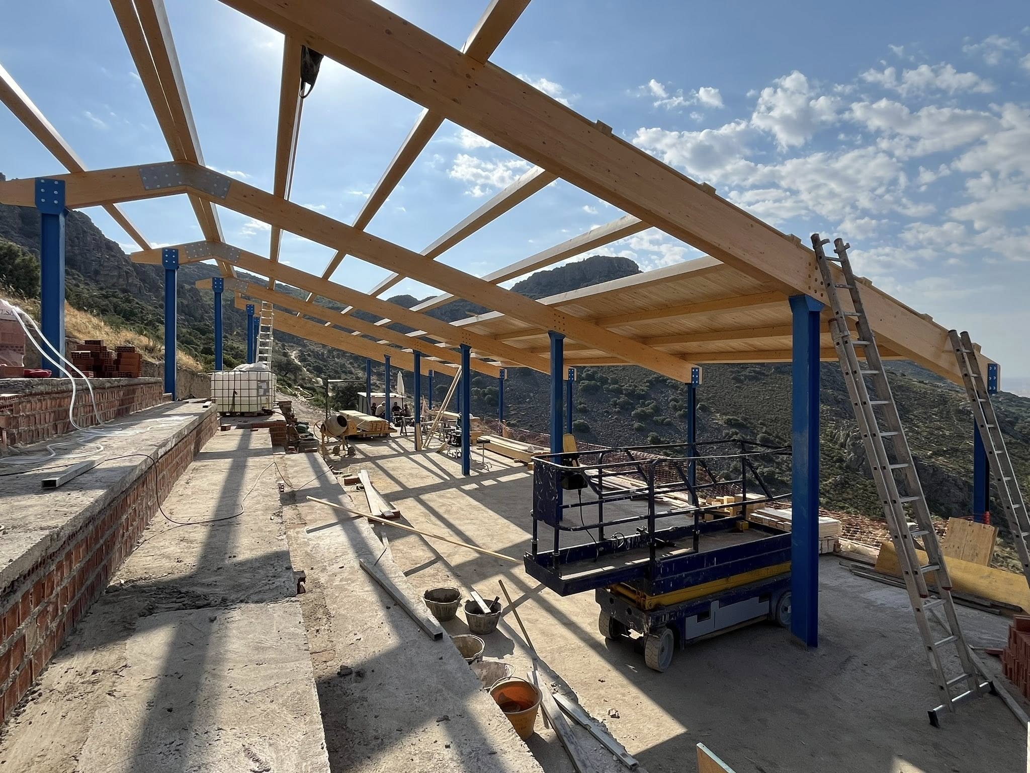 Uno de los elementos más destacados de la obra es su impresionante cubierta de madera, construida con vigas de abeto austriaco y entablamento de pino de Flandes, trabajos llevados a cabo por la empresa extremeña Abadía, con sede en Entrerríos.