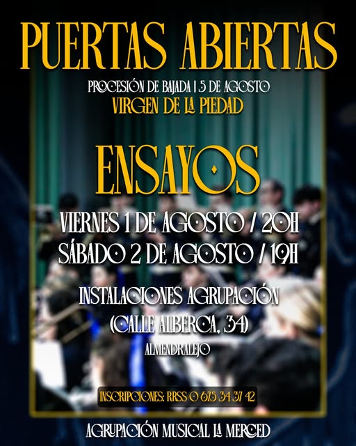 Como preparación para este importante evento, la agrupación realizará ensayos generales abiertos al público en sus instalaciones ubicadas en Calle Alberca, 34, en Almendralejo. Las sesiones están programadas para el viernes 1 de agosto a las 20:00 h y el sábado 2 de agosto a las 19:00 h.