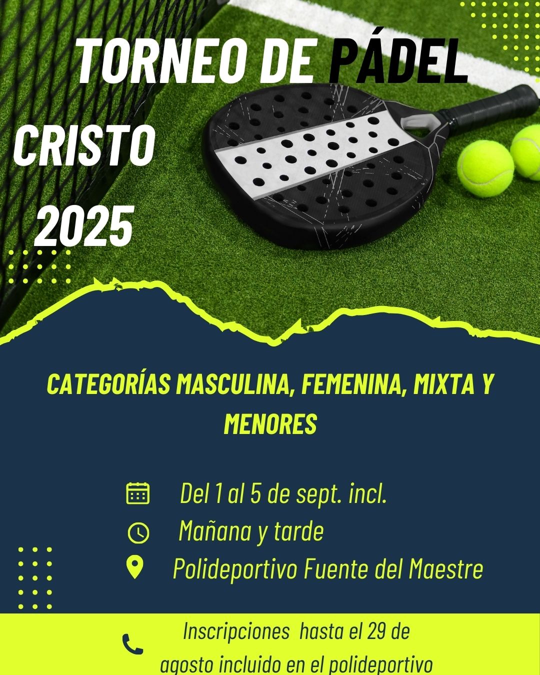 Con motivo de las Fiestas Patronales en Honor al Santísimo Cristo de las Misericordias 2025, el Patronato Municipal de Deportes de Fuente del Maestre organizará, del 1 al 5 de septiembre, un Torneo de Pádel.