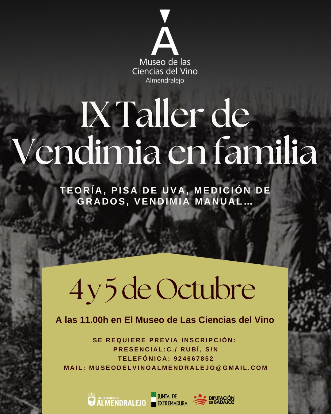 Del Amo ha destacado que se trata de una actividad ya consolidada en la programación cultural del museo y ha animado a las familias a participar para conocer de primera mano una tradición vinculada a la identidad vitivinícola de Almendralejo. Las inscripciones pueden formalizarse en el propio museo, a través del correo museodelvinalmendralejo.com o en el teléfono 924 667 852.