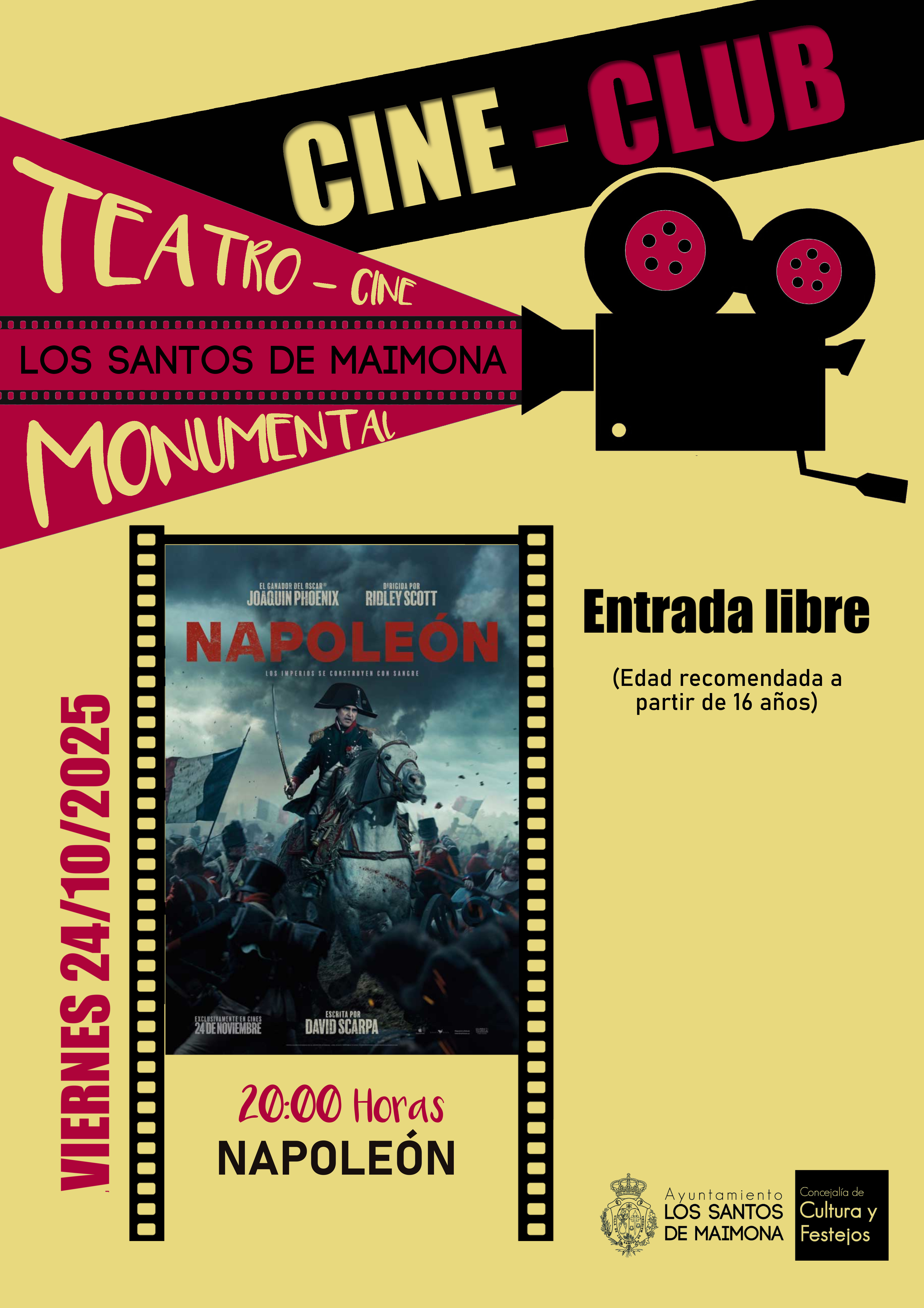 La Concejalía de Cultura del Ayuntamiento de Los Santos de Maimona continúa con el ciclo de otoño del Cineclub en el Teatro Cine Monumental este viernes, 24 de octubre, a las 20 horas con la proyección de ‘Napoleón’. La entrada es libre hasta completar aforo.