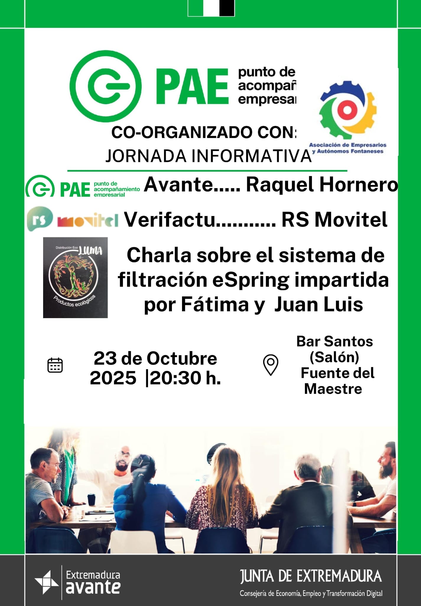 La Asociación de Empresarios y Autónomos de Fuente del Maestre, en coordinación con el Punto de Acompañamiento Empresarial (PAE) de Los Santos de Maimona, ha organizado una jornada informativa abierta a todos los empresarios fontaneses, que se celebrará este jueves 23 de octubre, a las 20:30 horas, en el Bar Santos (salón superior).
