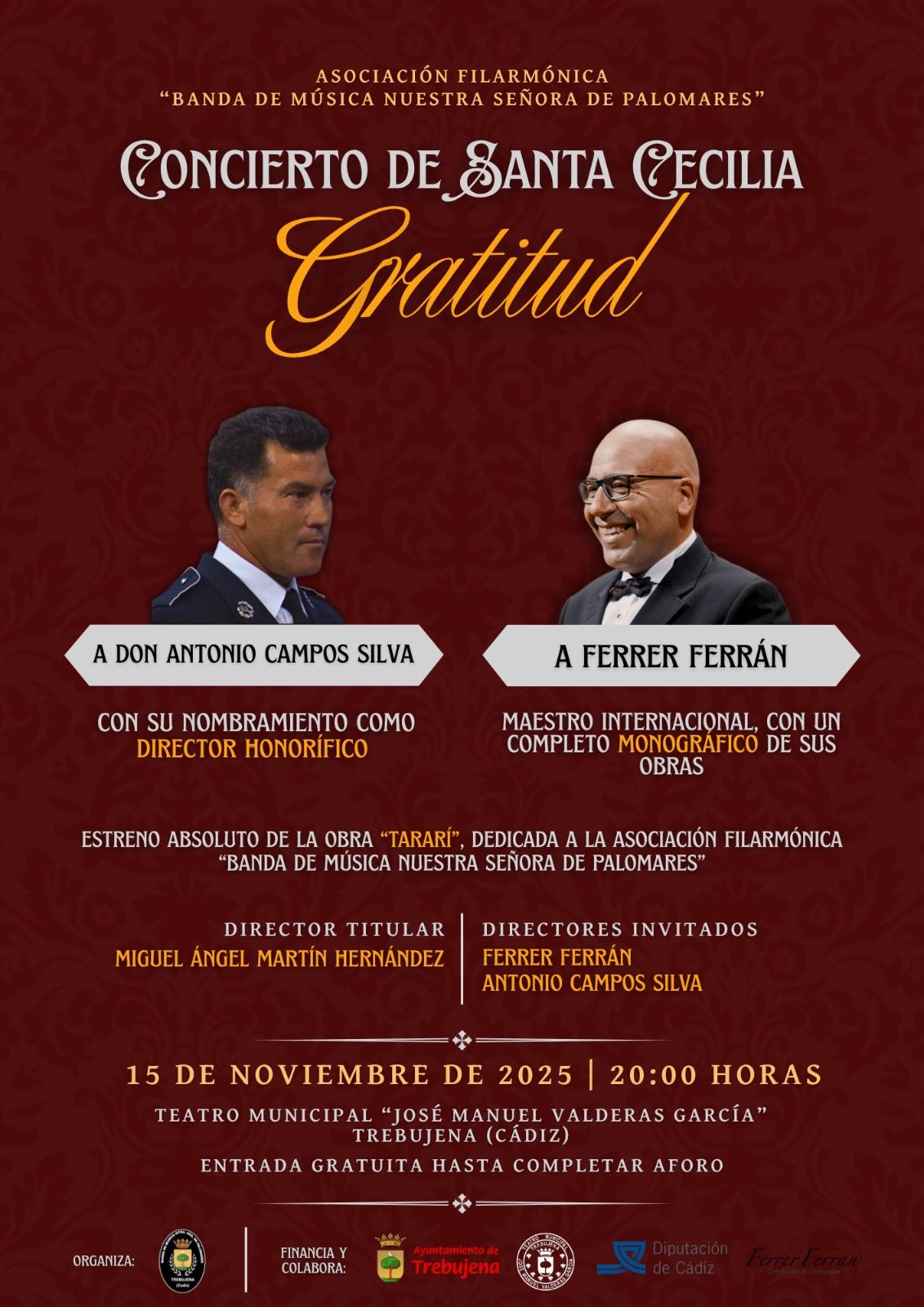 El Concierto de Santa Cecilia se ha convertido en una de las fechas más esperadas del calendario cultural de Trebujena. Este año, con el reconocimiento a Antonio Campos Silva, la presencia de Ferrer Ferrán y la dirección del ribereño Miguel Ángel Martín Hernández, la ocasión promete ser una auténtica celebración de la música en todas sus formas.