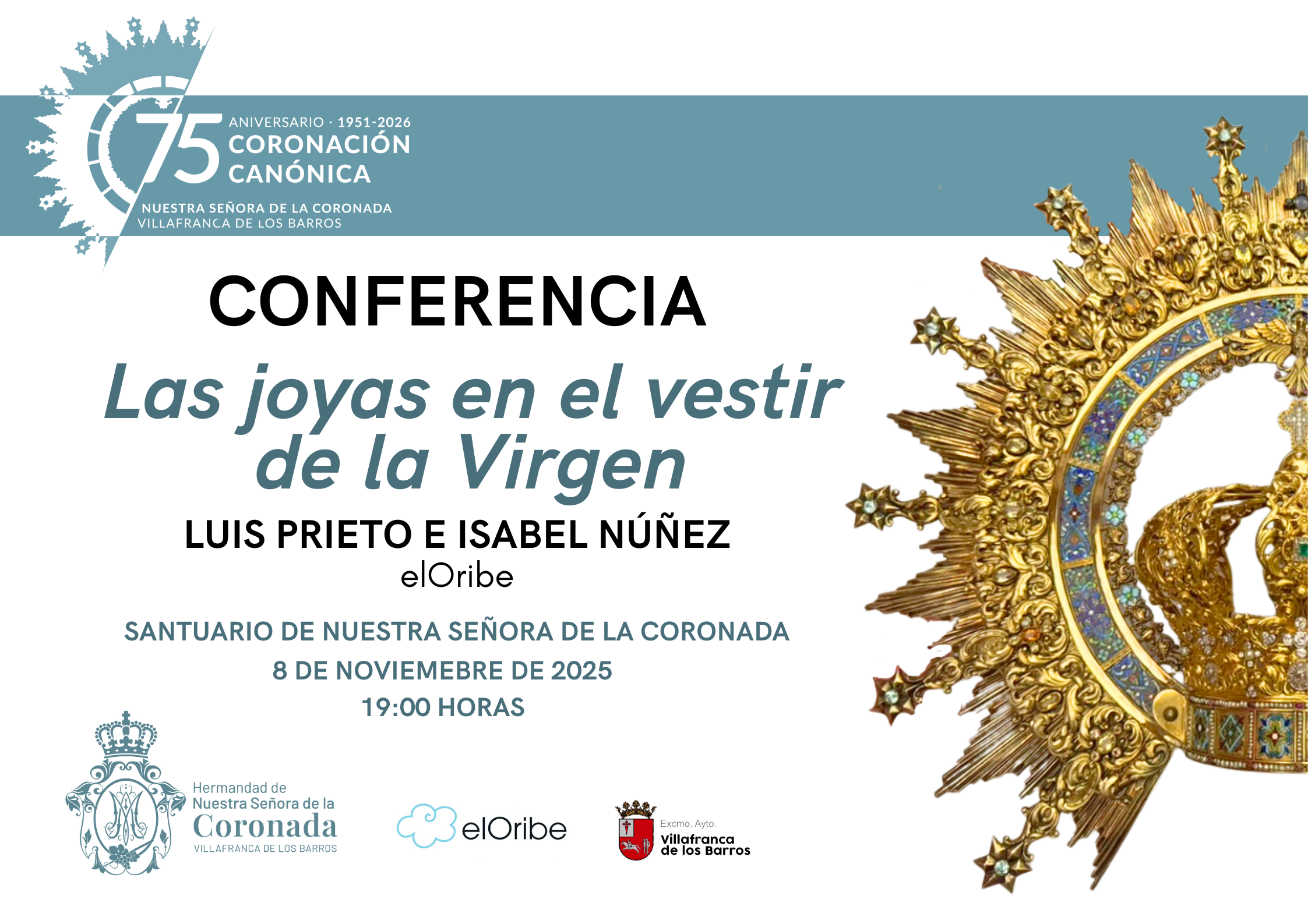 El próximo sábado, 8 de noviembre, se celebrará en el Santuario de la Coronada la conferencia titulada Las joyas en el vestir de la Virgen, a cargo de Isabel Núñez y Luis Prieto, del taller de orfebrería El Oribe de Jerez de la Frontera. La actividad comenzará a las 19:00 horas y la entrada será libre hasta completar aforo.