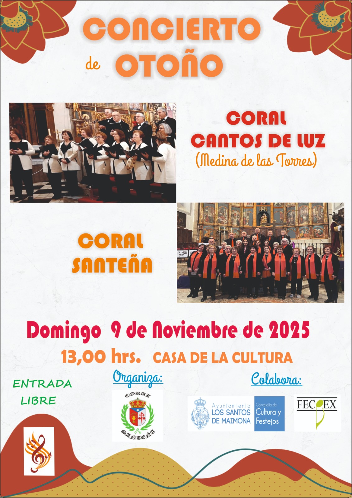 La Coral Santeña organiza para el próximo domingo 9 de noviembre, a las 13 horas en la Casa de la Cultura, un Concierto de Otoño, en el que compartirá escenario con la Coral Cantos de Luz, de Medina de las Torres.