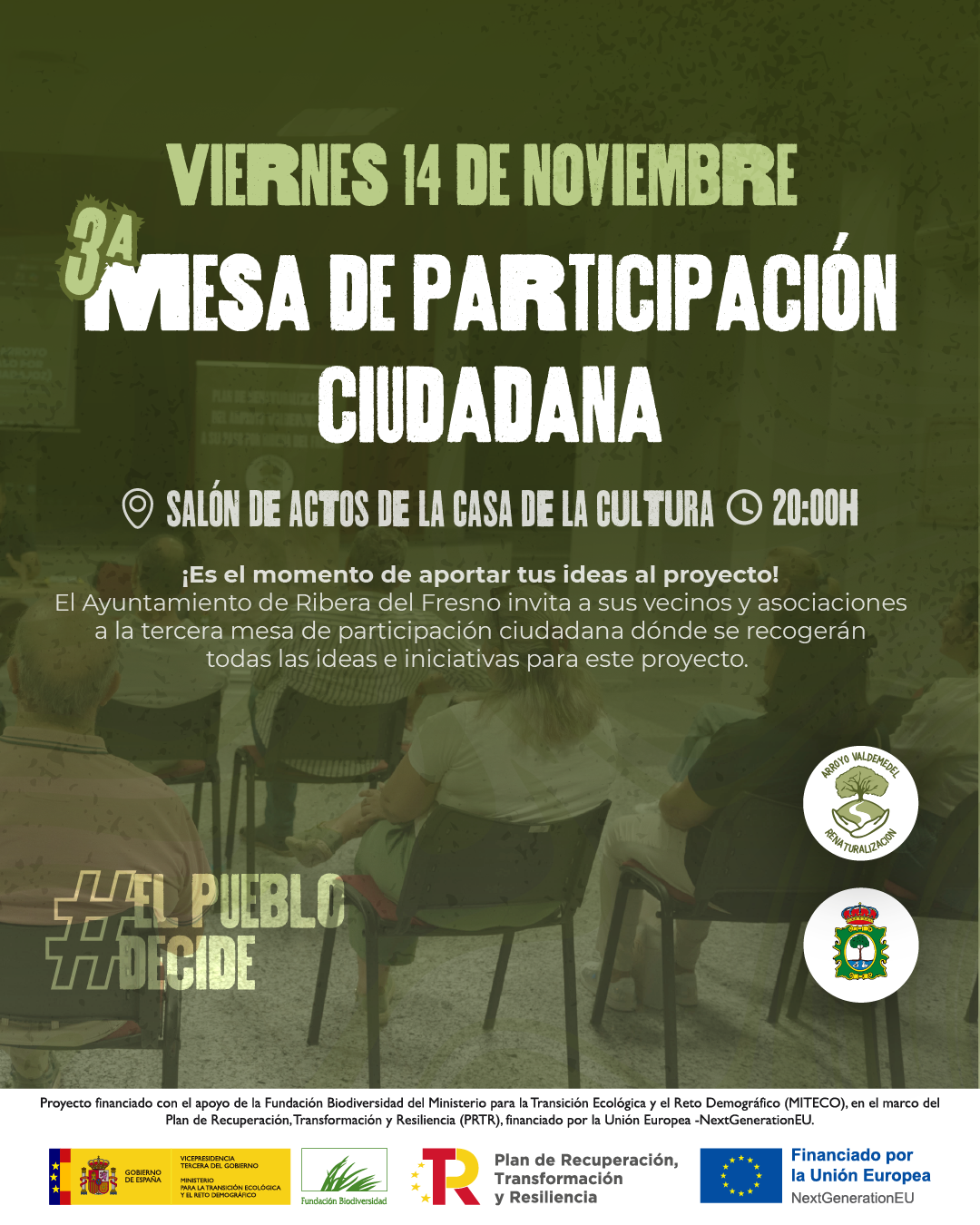 El próximo viernes, 14 de noviembre, a las 20:00 horas, se celebrará en el Salón de Actos de la Casa de la Cultura de Ribera del Fresno la tercera mesa de participación ciudadana del proyecto Renaturalización Arroyo Valdemedel.