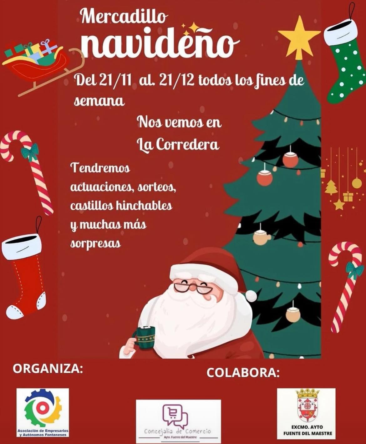 El mercadillo navideño de Fuente del Maestre se inaugurará el 21 de noviembre, coincidiendo con el encendido del alumbrado, y permanecerá abierto hasta el 21 de diciembre, fecha del Belén viviente. Será el tercer año consecutivo que La Corredera acoja esta iniciativa organizada por la Asociación de Empresarios y Autónomos, con la colaboración de la Concejalía de Comercio.