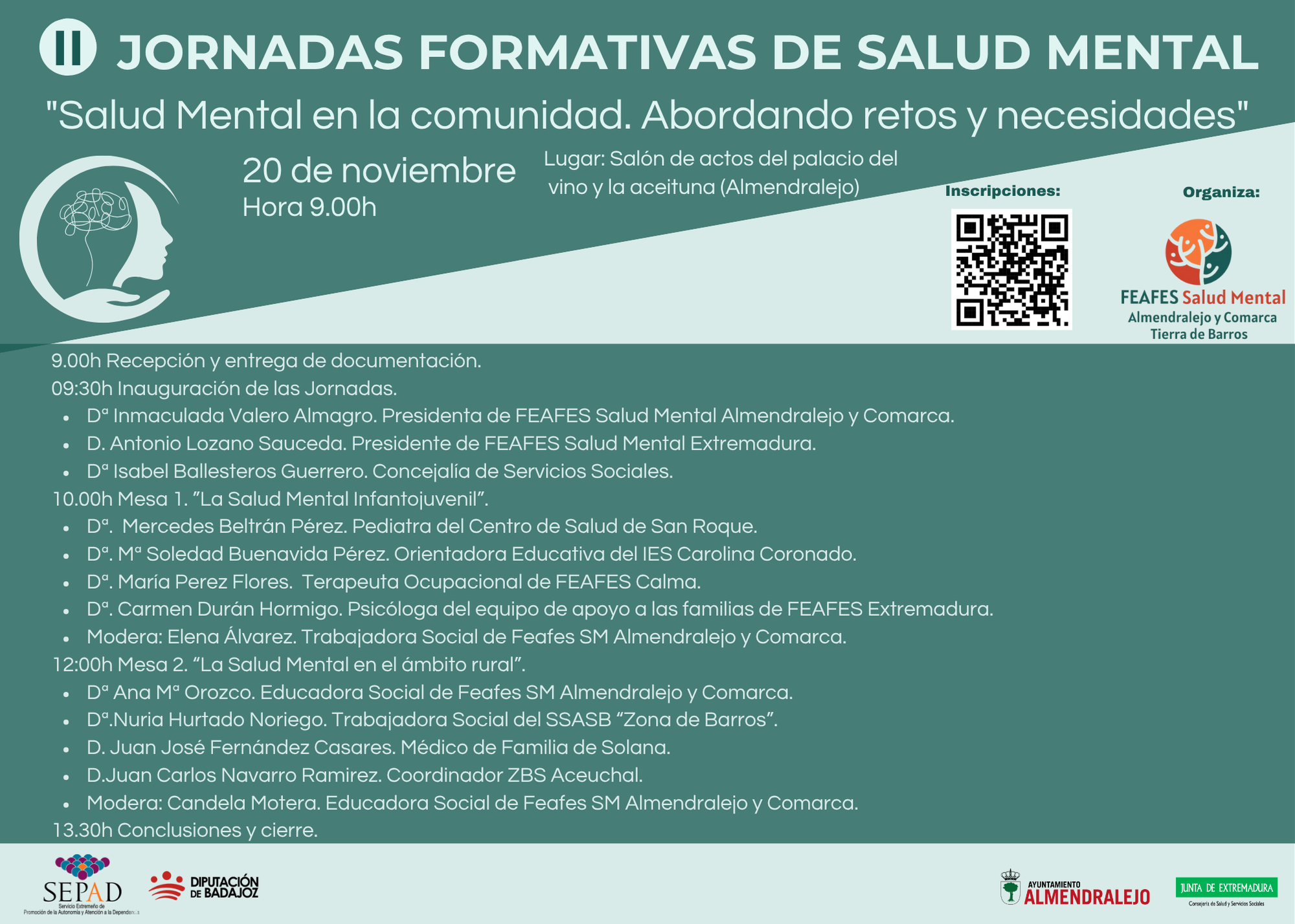 Las personas interesadas en asistir pueden inscribirse hasta el miércoles anterior al evento a través del código QR habilitado por la entidad o mediante el formulario disponible en línea. Para más información, Feafes SM Almendralejo pone a disposición los teléfonos 924 664 677 y 664 295 658, así como el correo electrónico info@feafesalmendralejo.com.