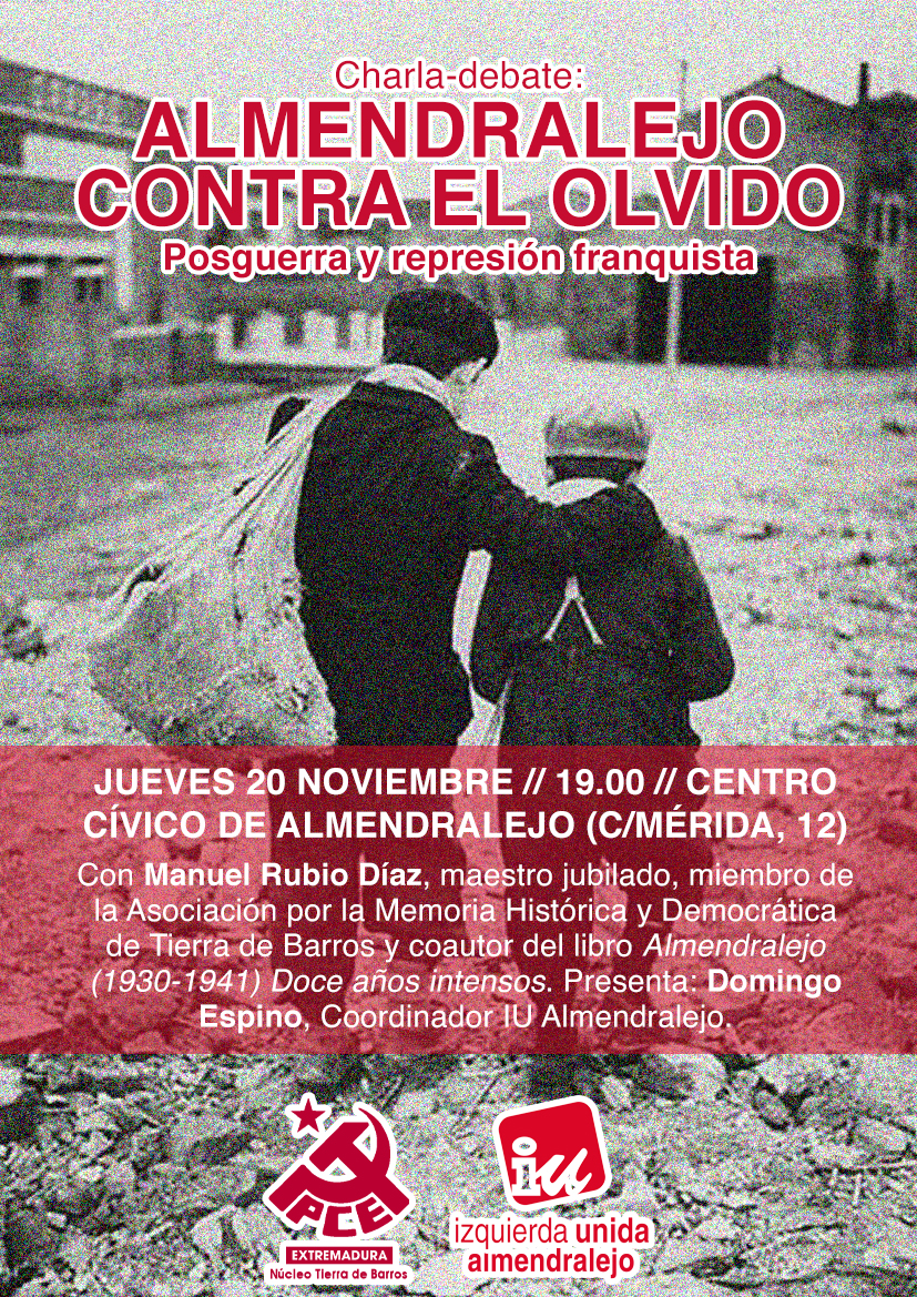 El acto titulado ‘Almendralejo contra el olvido. Posguerra y represión franquista’ será presentado por el nuevo Coordinador de IU Almendralejo, Domingo Espino, y en el participará Manuel Rubio Díaz, coautor del libro ‘Almendralejo 1930-1941. Doce años intensos’. Rubio es además maestro jubilado y miembro de la Asociación por la Memoria Histórica y Democrática de Tierra de Barros.