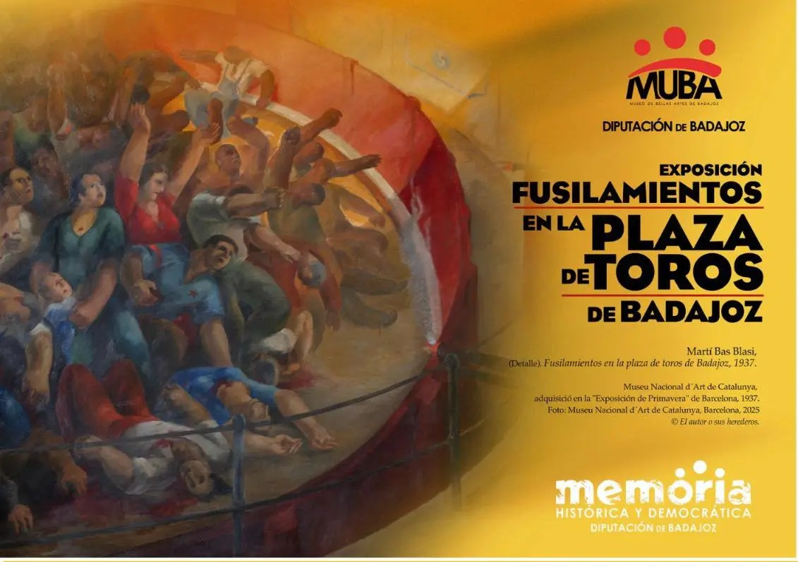 La exposición gira en torno a la reproducción del conocido lienzo que el artista catalán Martí Bas Blasi pintó en 1937, en plena Guerra Civil, como denuncia de los fusilamientos masivos perpetrados en la plaza de toros de Badajoz en agosto de 1936, uno de los episodios más sangrientos de la represión franquista en Extremadura. La obra original, adquirida ese mismo año por el Museo Nacional de Arte de Cataluña, se ha convertido con el tiempo en un símbolo pictórico de la memoria democrática.