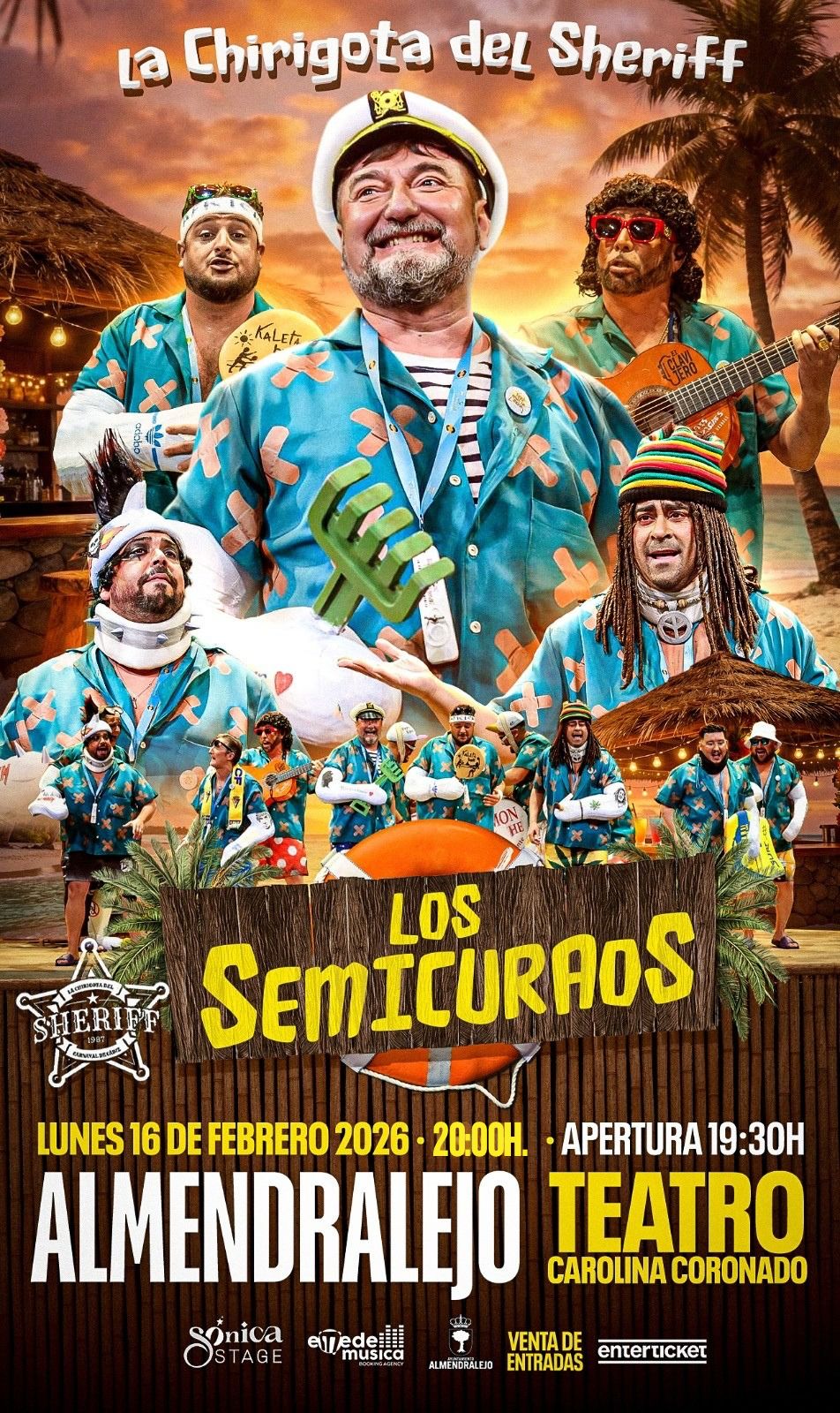 El Teatro Carolina Coronado de Almendralejo acogerá el próximo lunes de Carnaval, 16 de febrero, la actuación de la chirigota ‘Los Semicuraos’, conocida popularmente como la chirigota del Sheriff, en una cita que promete llenar el escenario de humor, ingenio e ironía al más puro estilo gaditano.