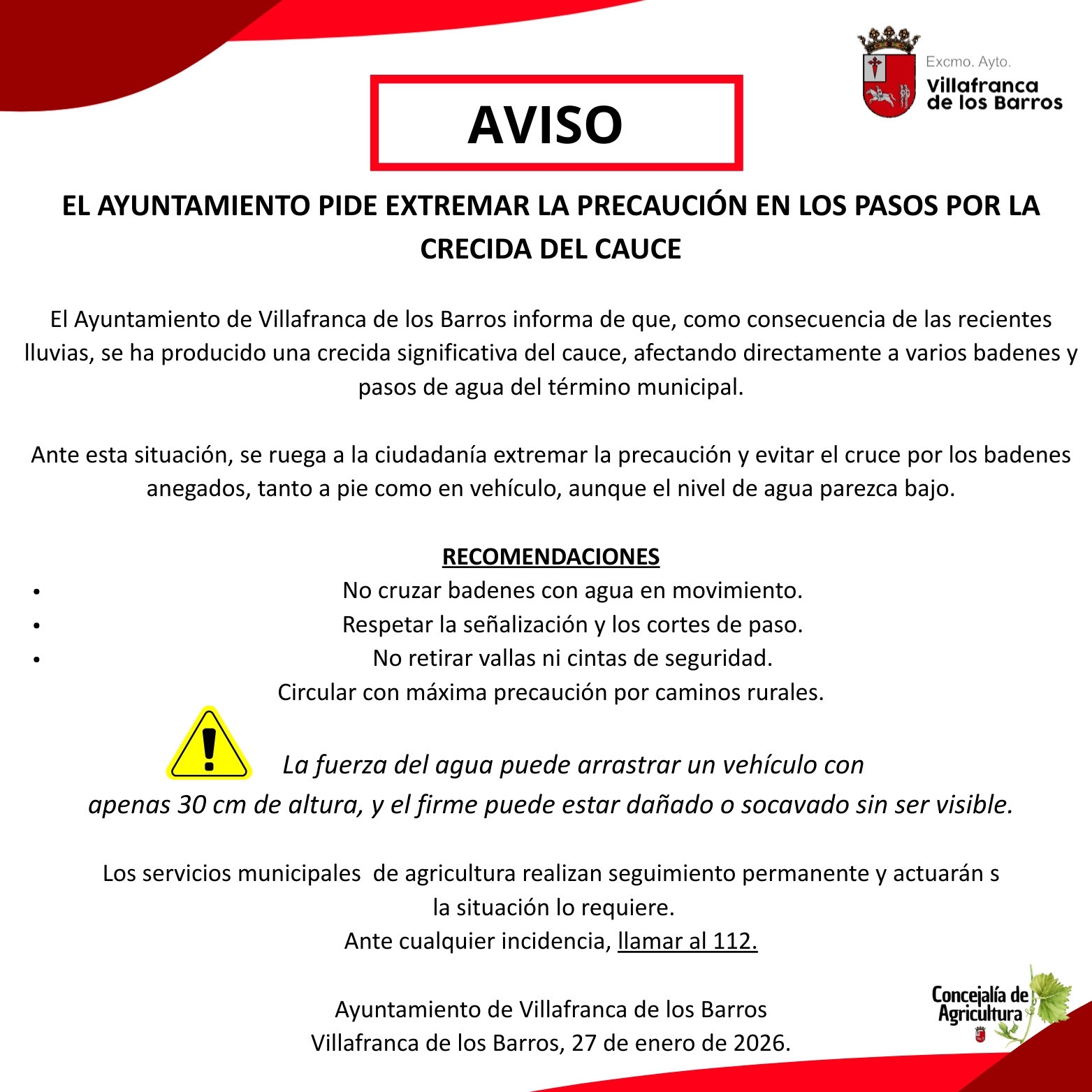 Desde el gobierno municipal se recuerda que la fuerza del agua puede llegar a arrastrar un vehículo con apenas 30 centímetros de altura y que el firme puede estar dañado o socavado sin que sea visible a simple vista.